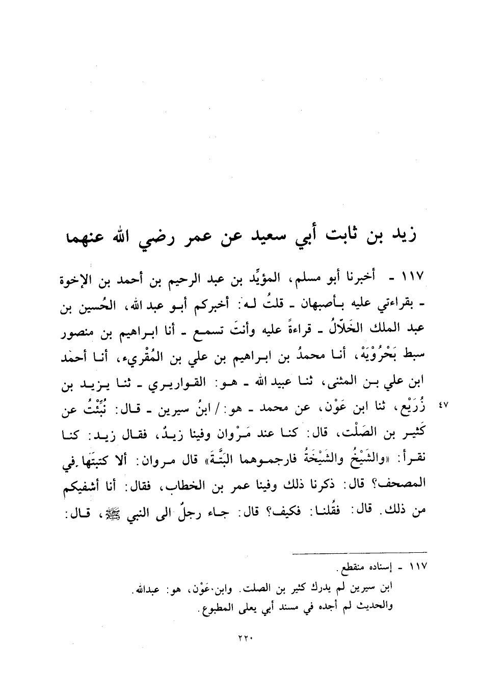 117 - أَخْبَرَنَا أَبُو مُسْلِمٍ الْمُؤَيَّدُ بن عبد الرَّحِيم بْنِ أَحْمَدَ بْنِ الإِخْوَةِ بِقِرَاءَتِي عَلَيْهِ بِأَصْبَهَانَ قلت لَهُ أخْبركُم أَبُو عبد الله الْحُسَيْن بن عبد الْملك الْخَلالُ قِرَاءَةً عَلَيْهِ وَأَنْتَ تَسْمَعُ أَنَا إِبْرَاهِيمُ بْنُ مَنْصُورٍ سِبْطُ بَحْرُوَيْهِ أَنا مُحَمَّدُ بْنُ إِبْرَاهِيم بن عَليّ بن الْمُقْرِئ أَنا أَحْمد ابْن عَليّ بن الْمثنى ثَنَا عبيد الله هُوَ الْقَوَارِيرِيُّ ثَنَا يَزِيدُ بْنُ زُرَيْعٍ ثَنَا ابْنُ عَوْنٍ عَنْ مُحَمَّدٍ هُوَ ابْنُ سِيرِينَ قَالَ نُبِّئْتُ عَنْ كَثِيرِ بْنِ الصَّلْتِ قَالَ كُنَّا عِنْدَ مَرْوَانَ وَفِينَا زَيْدٌ فَقَالَ زَيْدٌ كُنَّا نَقْرَأُ وَالشَّيْخُ وَالشَّيْخَةُ فَارْجُمُوهُمَا الْبَتَّةَ قَالَ مَرْوَانُ أَلا كَتَبْتَهَا فِي الْمُصْحَفِ قَالَ ذَكَرْنَا ذَلِكَ وَفِينَا عُمَرُ بْنُ الْخَطَّابِ فَقَالَ أَنا أَشْفِيكُمْ مِنْ ذَلِكَ قَالَ فَقُلْنَا فَكَيْفَ قَالَ جَاءَ رَجُلٌ إِلَى النَّبِيِّ صَلَّى اللَّهُ عَلَيْهِ وَسلم قَالَ