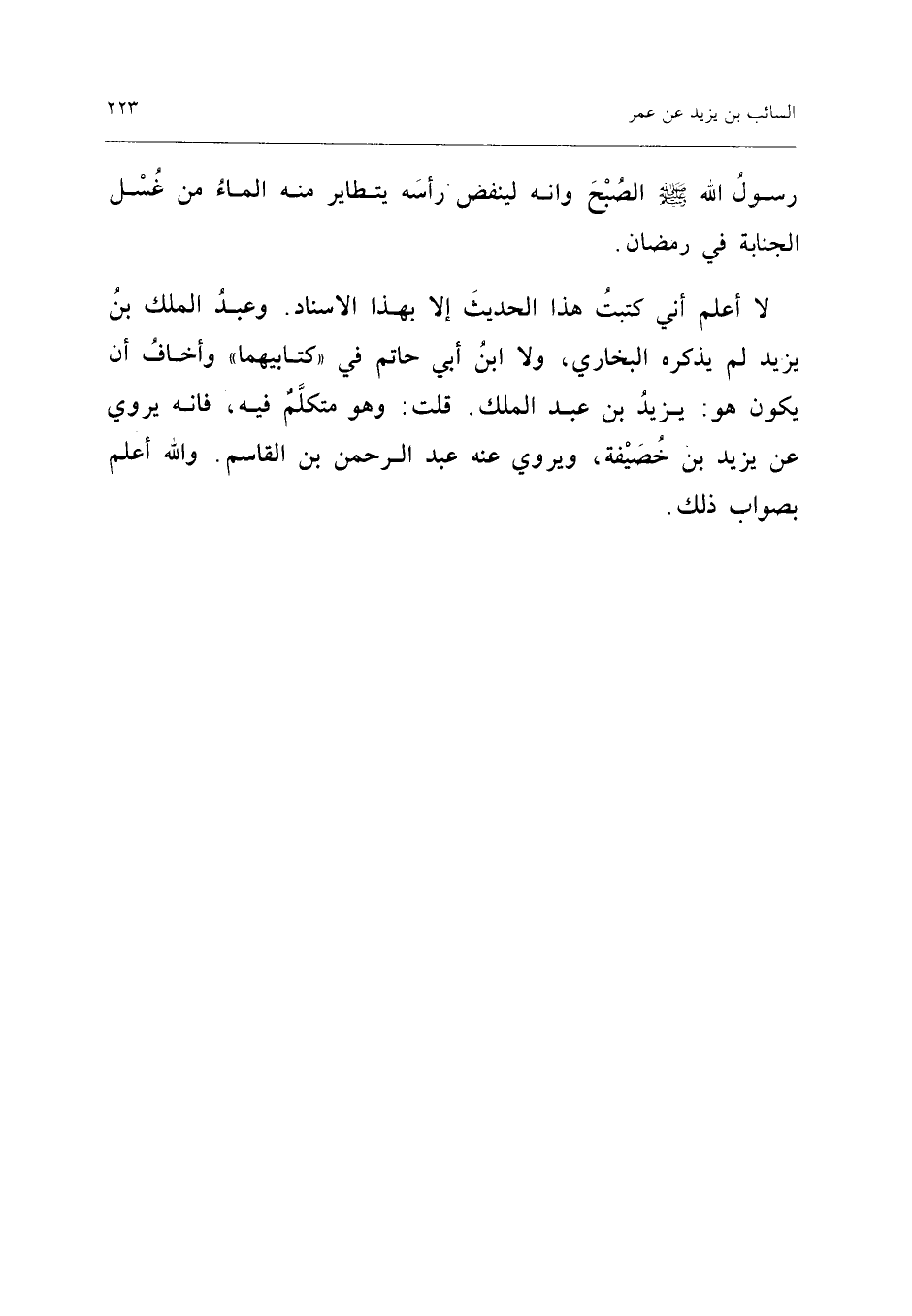 لَا أَعْلَمُ أَنِّي كَتَبْتُ هَذَا الْحَدِيثَ إِلا بِهَذَا الإِسْنَادِ وَعبد الْملك بْنُ يَزِيدَ لَمْ يَذْكُرْهُ الْبُخَارِيُّ وَلا ابْنُ أَبِي حَاتِمٍ فِي كِتَابَيْهِمَا وَأَخَافُ أَنْ يَكُونَ هُوَ يزِيد بن عبد الْملك قُلْتُ وَهُوَ مُتَكَلَّمٌ فِيهِ فَإِنَّهُ يَرْوِي عَنْ يزِيد بن خصيفَة ويروي عَنهُ عبد الرَّحْمَن بن الْقَاسِم وَالله أعلم بصواب ذَلِك (إِسْنَاده ضَعِيف)