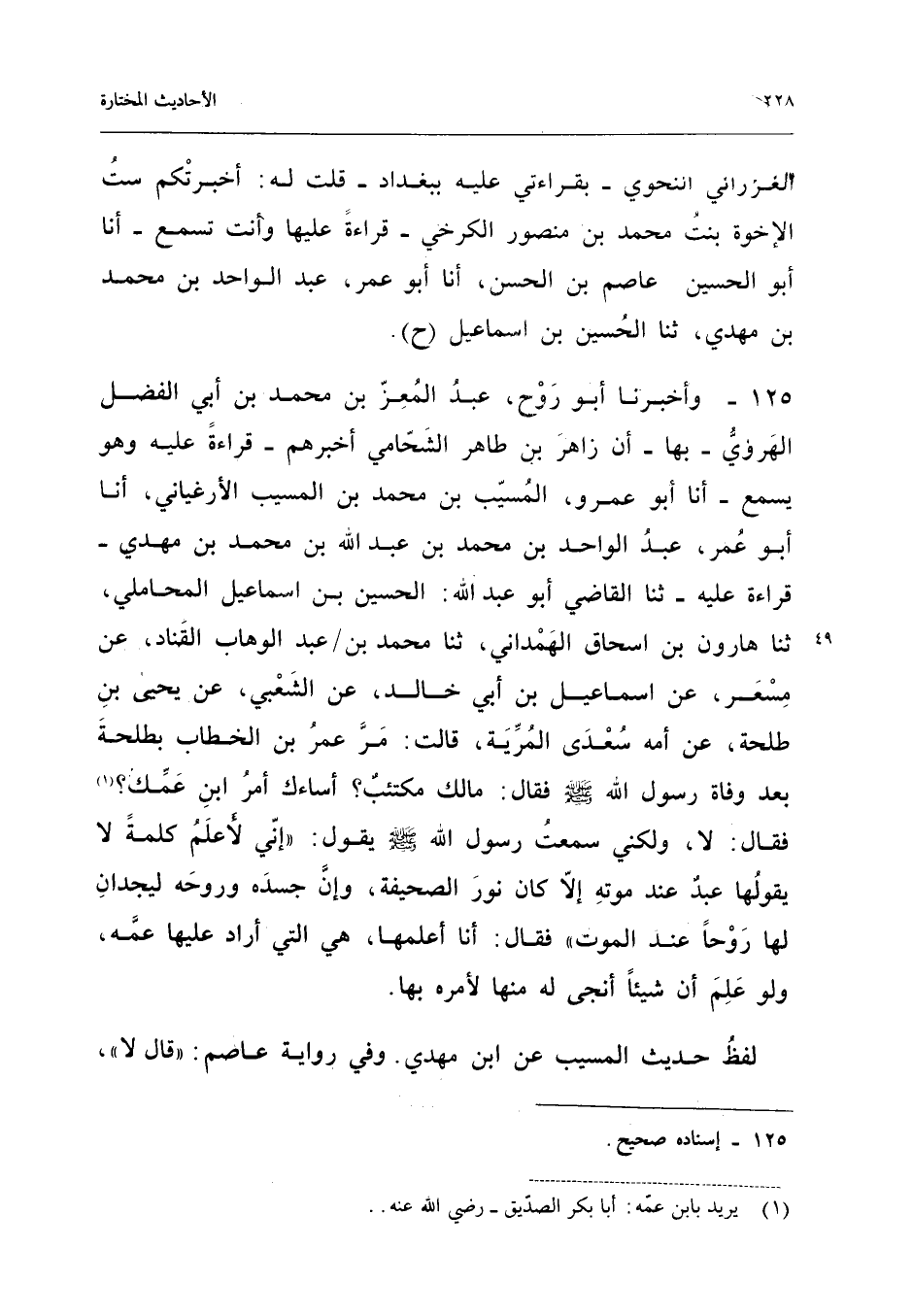 125 - وَأخْبرنَا أَبُو روح عبد الْمعز بْنُ مُحَمَّدِ بْنِ أَبِي الْفَضْلِ الْهَرَوِيُّ بِهَا أَنَّ زَاهِرَ بْنَ طَاهِرٍ الشَّحَّامِيَّ أَخْبَرَهُمْ قِرَاءَةً عَلَيْهِ وَهُوَ يَسْمَعُ أَنا أَبُو عَمْرٍو الْمُسَيَّبُ بْنُ مُحَمَّدِ بْنِ الْمُسَيَّبِ الأَرْغِيَانِيُّ أَنا أَبُو عمر عبد الْوَاحِد بن مُحَمَّد بن عبد الله بن مُحَمَّد بن مهْدي قراء عَلَيْهِ ثَنَا القَاضِي أَبُو عبد الله الْحُسَيْنُ بْنُ إِسْمَاعِيلَ الْمَحَامِلِيُّ ثَنَا هَارُونُ بْنُ إِسْحَاق الْهَمدَانِي ثَنَا مُحَمَّد بن عبد الْوَهَّاب الْقَنَّادُ عَنْ مِسْعَرٍ عَنْ إِسْمَاعِيلَ بْنِ أَبِي خَالِدٍ عَنِ الشَّعْبِيِّ عَنْ يَحْيَى بْنِ طَلْحَةَ عَنْ أُمِّهِ سُعْدَى الْمُرِّيَّةِ قَالَتْ مَرَّ عُمَرُ بْنُ الْخَطَّابِ بِطَلْحَةَ بَعْدَ وَفَاةِ رَسُولِ اللَّهِ صلى الله عَلَيْهِ وَسلم فَقَالَ مَالك مُكْتَئِبٌ أَسَاءَكَ أَمْرُ ابْنِ عَمِّكَ فَقَالَ لَا وَلَكِنِّي سَمِعْتُ رَسُولَ اللَّهِ صَلَّى اللَّهُ عَلَيْهِ وَسَلَّمَ يَقُولُ إِنِّي لأَعْلَمُ كَلِمَةً لَا يَقُولُهَا عَبْدٌ عِنْدَ مَوْتِهِ إِلا كَانَ نُورُ الصَّحِيفَةِ وَإِنَّ جَسَدَهُ وَرُوحَهُ لَيَجِدَانِ لَهَا رَوْحًا عِنْدَ الْمَوْتِ فَقَالَ أَنَا أَعْلَمُهَا هِيَ الَّتِي أَرَادَ عَلَيْهَا عَمَّهُ وَلَوْ عَلِمَ أَنَّ شَيْئًا أَنْجَى لَهُ مِنْهَا لأَمَرَهُ بِهَا