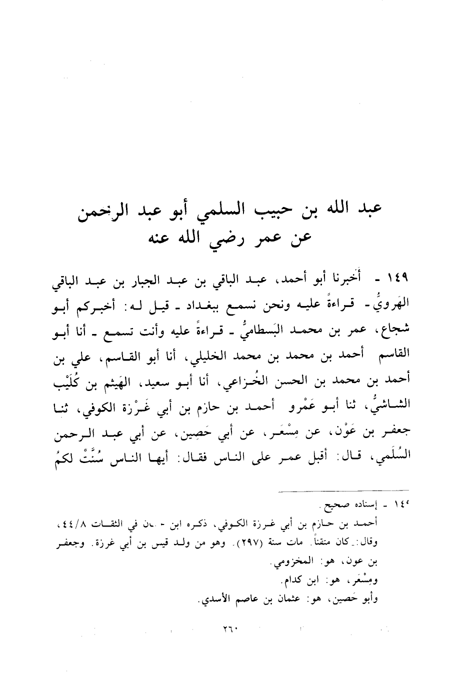 149 - أَخْبَرَنَا أَبُو أَحْمد عبد الْبَاقِي بن عبد الْجَبَّار بن عبد الْبَاقِي الْهَرَوِيُّ قِرَاءَةً عَلَيْهِ وَنَحْنُ نَسْمَعُ بِبَغْدَادَ قِيلَ لَهُ أَخْبَرَكُمْ أَبُو شُجَاعٍ عُمَرُ بْنُ مُحَمَّدِ الْبَسْطَامِيُّ قِرَاءَةً عَلَيْهِ وَأَنْتَ تَسْمَعُ أَنا أَبُو الْقَاسِمِ أَحْمَدُ بْنُ مُحَمَّدِ بْنِ مُحَمَّدٍ الْخَلِيلِيُّ أَنا أَبُو الْقَاسِمِ عَلِيُّ بْنُ أَحْمَدَ بْنِ مُحَمَّدِ بْنِ الْحَسَنِ الْخُزَاعِيُّ أَنا أَبُو سَعِيدٍ الْهَيْثَمُ بْنُ كُلَيْبٍ الشَّاشِيُّ ثَنَا أَبُو عَمْرٍو أَحْمَدُ بْنُ حَازِمِ بْنِ أَبِي غَرْزَةَ الْكُوفِي ثَنَا جَعْفَر بن عون عَن مسعر عَن أبي حُصَيْن عَن أبي عبد الرَّحْمَن السُّلَمِيِّ قَالَ أَقْبَلَ عُمَرُ عَلَى النَّاسِ فَقَالَ أَيُّهَا النَّاسُ سُنَّتْ لَكُمُ الرَّكْبُ فَأَمْسَوْا بِالرَّكْبِ (إِسْنَاده صَحِيح)