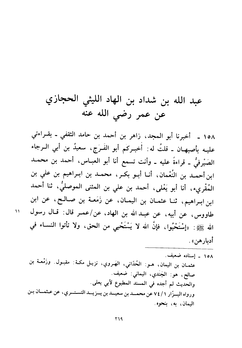 158 - أَخْبَرَنَا أَبُو الْمَجْدِ زَاهِرُ بْنُ أَحْمَدَ بْنِ حَامِدٍ الثَّقَفِيُّ بِقِرَاءَتِي عَلَيْهِ بِأَصْبَهَانَ قُلْتُ لَهُ أَخْبَرَكُمْ أَبُو الْفَرَجِ سَعِيدُ بْنُ أَبِي الرَّجَاءِ الصَّيْرَفِيُّ قِرَاءَةً عَلَيْهِ وَأَنْتَ تَسْمَعُ أَنا أَبُو الْعَبَّاسِ أَحْمَدُ بْنُ مُحَمَّد ابْن أَحْمَدَ بْنِ النُّعْمَانِ أَنا أَبُو بَكْرٍ مُحَمَّدُ بن إِبْرَاهِيم بن عَليّ بن الْمُقْرِئِ أَنا أَبُو يَعْلَى أَحْمَدُ بْنُ عَلِيِّ بن الْمثنى الْموصِلِي ثَنَا أَحْمد ابْن إِبْرَاهِيمَ ثَنا عُثْمَانُ بْنُ الْيَمَانِ عَنْ زَمْعَةَ بن صَالح عَن ابْن طَاوُوس عَن أَبِيه عَن عبد الله بْنِ الْهَادِ عَنْ عُمَرَ قَالَ قَالَ رَسُولُ اللَّهِ صَلَّى اللَّهُ عَلَيْهِ وَسَلَّمَ اسْتَحْيُوا فَإِنَّ الله لَا يستحيي مِنَ الْحَقِّ وَلا تَأْتُوا النِّسَاءَ فِي أَدْبَارِهِنَّ