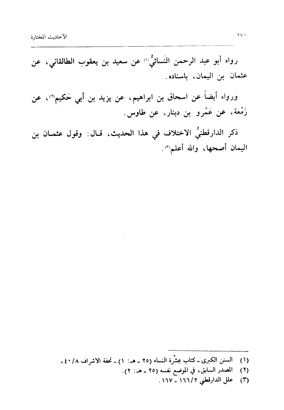 رَوَاهُ أَبُو عبد الرَّحْمَن النَّسَائِيُّ عَنْ سَعِيدِ بْنِ يَعْقُوبَ الطَّالْقَانِيِّ عَنْ عُثْمَانَ بْنِ الْيَمَانِ بِإِسْنَادِهِ وَرَوَاهُ أَيْضًا عَنْ إِسْحَاقَ بْنِ إِبْرَاهِيمَ عَنْ يَزِيدَ بْنِ أَبِي حَكِيمٍ عَنْ زَمْعَةَ عَنْ عَمْرِو بْنِ دِينَارٍ عَنْ طَاوُسٍ ذَكَرَ الدَّارَقُطْنِيُّ الاخْتِلافَ فِي هَذَا الْحَدِيثِ قَالَ وَقَوْلُ عُثْمَانَ بْنِ الْيَمَانِ أَصَحُّهَا وَالله أعلم (إِسْنَاده ضَعِيف)