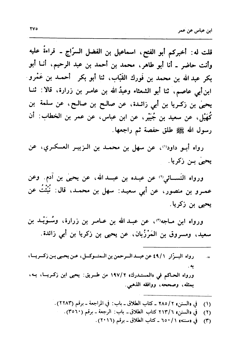 قُلْتُ لَهُ أَخْبَرَكُمْ أَبُو الْفَتْحِ إِسْمَاعِيلُ بْنُ الْفَضْلِ السَّرَّاجُ قِرَاءَةً عَلَيْهِ وَأَنْتَ حَاضِرٌ أَنا أَبُو طَاهِر مُحَمَّد بن أَحْمد بن عبد الرَّحِيم أَنا أَبُو بكر عبد الله بْنُ مُحَمَّدِ بْنِ فَوْرَكٍ الْقَبَّابُ ثَنَا أَبُو بَكْرٍ أَحْمَدُ بْنُ عَمْرٍو ابْنُ أَبِي عَاصِمٍ ثَنَا أَبُو الشعْثَاء وَعبد الله بْنُ عَامِرِ بْنِ زُرَارَةَ قَالا ثَنَا يَحْيَى بْنُ زَكَرِيَّا بْنِ أَبِي زَائِدَةَ عَنْ صَالِحِ بْنِ صَالِحٍ عَنْ سَلَمَةَ بْنِ كُهَيْلٍ عَنْ سَعِيدِ بْنِ جُبَيْرٍ عَنِ ابْنِ عَبَّاسٍ عَنْ عُمَرَ بْنِ الْخَطَّابِ أَنَّ رَسُولَ اللَّهِ صَلَّى اللَّهُ عَلَيْهِ وَسَلَّمَ طَلَّقَ حَفْصَةَ ثُمَّ رَاجَعَهَا