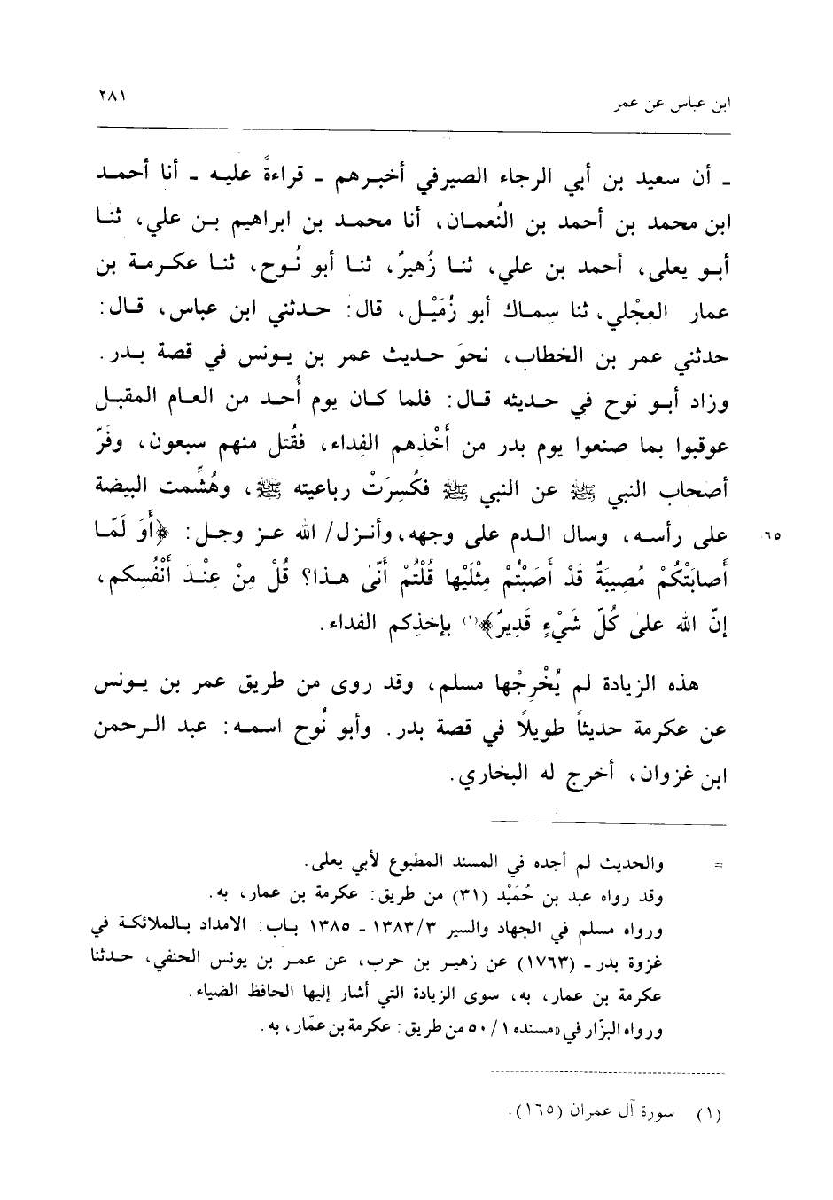 أَنَّ سَعِيدَ بْنَ أَبِي الرَّجَاءِ الصَّيْرَفِيَّ أَخْبَرَهُمْ قِرَاءَة عَلَيْهِ أَنا أَحْمد ابْن مُحَمَّدِ بْنِ أَحْمَدَ بْنِ النُّعْمَانِ أَنا مُحَمَّدُ بن إِبْرَاهِيم بن عَليّ ثَنَا أَبُو يَعْلَى أَحْمَدُ بْنُ عَلِيٍّ ثَنَا زُهَيْرٌ ثَنَا أَبُو نُوحٍ ثَنَا عِكْرِمَةُ بْنُ عَمَّارٍ الْعِجْلِيُّ ثَنَا سِمَاكٌ أَبُو زُمَيْلٍ قَالَ حَدَّثَنِي ابْنُ عَبَّاسٍ قَالَ حَدَّثَنِي عُمَرُ بْنُ الْخَطَّابِ نَحْوَ حَدِيثِ عُمَرَ بْنِ يُونُسَ فِي قِصَّةِ بَدْرٍ وَزَادَ أَبُو نُوحٍ فِي حَدِيثِهِ قَالَ فَلَمَّا كَانَ يَوْمُ أُحُدٍ مِنَ الْعَامِ الْمُقْبِلِ عُوقِبُوا بِمَا صَنَعُوا يَوْمَ بَدْرٍ مِنْ أَخْذِهِمُ الْفِدَاءَ فَقُتِلَ مِنْهُمْ سَبْعُونَ وَفَرَّ أَصْحَابُ النَّبِيِّ صَلَّى اللَّهُ عَلَيْهِ وَسَلَّمَ عَنِ النَّبِيِّ صَلَّى اللَّهُ عَلَيْهِ وَسَلَّمَ فَكُسِرَتْ رَبَاعِيَتُهُ صَلَّى اللَّهُ عَلَيْهِ وَسَلَّمَ وَهُشِّمَتِ الْبَيْضَةُ عَلَى رَأْسِهِ وَسَالَ الدَّمُ عَلَى وَجْهِهِ وَأَنْزَلَ اللَّهُ عَزَّ وَجل {أَو لما أَصَابَتْكُمْ مُصِيبَةٌ قَدْ أَصَبْتُمْ مِثْلَيْهَا قُلْتُمْ أَنَّى هَذَا قُلْ هُوَ مِنْ عِنْدِ أَنْفُسِكُمْ إِنَّ الله على كل شَيْء قدير} بِأَخْذِكُمُ الْفِدَاءَ