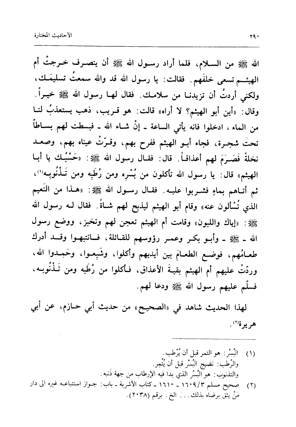 اللَّهِ صَلَّى اللَّهُ عَلَيْهِ وَسَلَّمَ مِنَ السَّلامِ فَلَمَّا أَرَادَ رَسُولُ اللَّهِ صَلَّى اللَّهُ عَلَيْهِ وَسَلَّمَ أَنْ يَنْصَرِفَ خَرَجَتْ أُمُّ الْهَيْثَمِ تَسْعَى خَلْفَهُمْ فَقَالَتْ يَا رَسُولَ اللَّهِ قَدْ وَاللَّهِ سَمِعْتُ تَسْلِيمَكَ وَلَكِنِّي أَرَدْتُ أَنْ تَزِيدَنَا مِنْ سَلامِكَ فَقَالَ لَهَا رَسُولُ اللَّهِ صَلَّى اللَّهُ عَلَيْهِ وَسَلَّمَ خَيْرًا وَقَالَ أَيْنَ أَبُو الْهَيْثَمِ لَا أَرَاهُ قَالَتْ هُوَ قَرِيبٌ ذَهَبَ يَسْتَعْذِبُ لَنَا مِنَ الْمَاءِ ادْخُلُوا فَإِنَّهُ يَأْتِي السَّاعَةَ إِنْ شَاءَ اللَّهُ فَبَسَطَتْ لَهُمْ بِسَاطًا تَحْتَ شَجَرَةٍ فَجَاءَ أَبُو الْهَيْثَمِ فَفَرِحَ بِهِمْ وَقَرَّتْ عَيْنَاهُ بِهِمْ وَصَعِدَ نَخْلَةً فَصَرَمَ لَهُمْ أَعْذَاقًا قَالَ فَقَالَ رَسُولُ اللَّهِ صَلَّى اللَّهُ عَلَيْهِ وَسَلَّمَ حَسْبُكَ يَا أَبَا الْهَيْثَمِ قَالَ يَا رَسُولَ اللَّهِ تَأْكُلُونَ مِنْ بُسْرِهِ وَمِنْ رَطِبِهِ وَمِنْ تَذْنُوبِهِ ثُمَّ أَتَاهُمْ بِمَاءٍ فَشَرِبُوا عَلَيْهِ فَقَالَ رَسُولُ اللَّهِ صَلَّى اللَّهُ عَلَيْهِ وَسَلَّمَ هَذَا مِنَ النَّعِيمِ الَّذِي تُسْأَلُونَ عَنْهُ وَقَامَ أَبُو الْهَيْثَمِ لِيَذْبَحَ لَهُمْ شَاةً فَقَالَ لَهُ رَسُولُ اللَّهِ صَلَّى اللَّهُ عَلَيْهِ وَسَلَّمَ إِيَّاكَ وَاللَّبُونَ وَقَامَتْ أُمُّ الْهَيْثَمِ تَعْجِنُ لَهُمْ وَتَخْبِزُ وَوَضَعَ رَسُولُ اللَّهِ صَلَّى اللَّهُ عَلَيْهِ وَسَلَّمَ وَأَبُو بكر وَعمر رؤوسهم لِلْقَائِلَةِ فَانْتَبَهُوا وَقَدْ أَدْرَكَ طَعَامُهُمْ فوُضِعَ الطَّعَامُ بَيْنَ أَيْدِيهِمْ وَأَكَلُوا وَشَبِعُوا وَحَمِدُوا اللَّهَ وَرَدَّتْ عَلَيْهِمْ أُمُّ الْهَيْثَمِ بَقِيَّةَ الأَعْذَاقِ فَأَكَلُوا مِنْ رَطِبِهِ وَمِنْ تَذْنُوبِهِ فَسَلَّمَ عَلَيْهِمْ رَسُولُ اللَّهِ صَلَّى اللَّهُ عَلَيْهِ وَسَلَّمَ وَدَعَا لَهُمْ