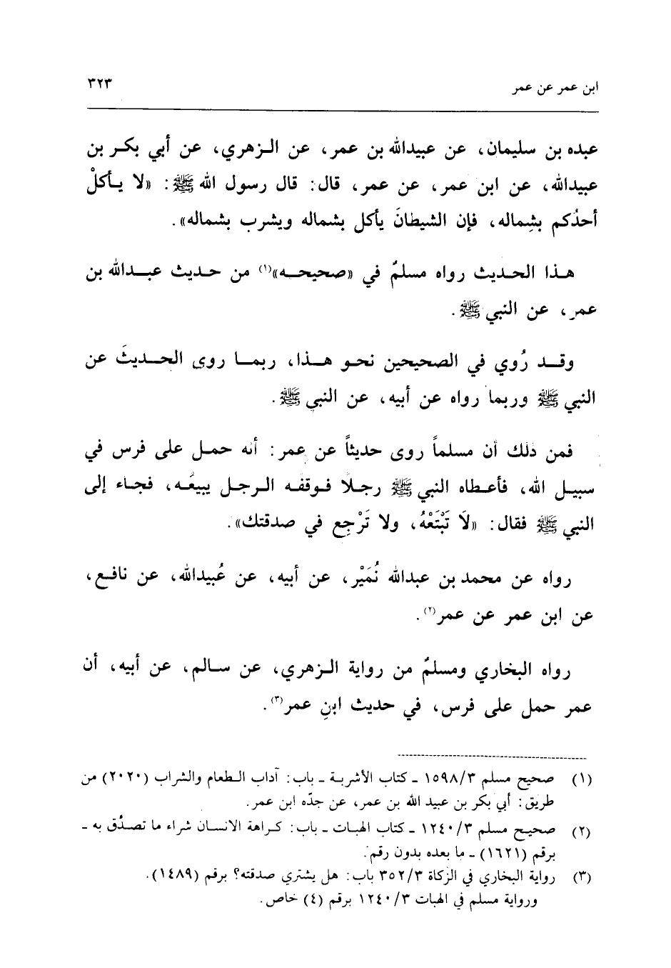 هَذَا الْحَدِيثُ رَوَاهُ مُسلم فِي صَحِيحه من حَدِيث عبد الله بْنِ عُمَرَ عَنِ النَّبِيِّ صَلَّى اللَّهُ عَلَيْهِ وَسَلَّمَ وَقَدْ رُوِيَ فِي الصَّحِيحَيْنِ نَحْوَ هَذَا رُبَّمَا رَوَى الْحَدِيثَ عَنِ النَّبِيِّ صَلَّى اللَّهُ عَلَيْهِ وَسَلَّمَ وَرُبَّمَا رَوَاهُ عَنْ أَبِيهِ عَنِ النَّبِيِّ صَلَّى اللَّهُ عَلَيْهِ وَسَلَّمَ فَمِنْ ذَلِكَ أَنَّ مُسْلِمًا رَوَى حَدِيثًا عَنْ عُمَرَ أَنَّهُ حَمَلَ عَلَى فَرَسٍ فِي سَبِيلِ اللَّهِ فَأَعْطَاهُ النَّبِيُّ صَلَّى اللَّهُ عَلَيْهِ وَسَلَّمَ رَجُلا فَوَقَفَهُ الرَّجُلُ يَبِيعُهُ فَجَاءَ إِلَى النَّبِيِّ صَلَّى اللَّهُ عَلَيْهِ وَسَلَّمَ فَقَالَ لَا تَبْتَعْهُ وَلا تَرْجِعْ فِي صدقتك رَوَاهُ عَن مُحَمَّد بن عبد الله نمير عَن أَبِيه عَن عبيد الله عَنْ نَافِعٍ عَنِ ابْنِ عُمَرَ عَنْ عُمَرَ رَوَاهُ الْبُخَارِيُّ وَمُسْلِمٌ مِنْ رِوَايَةِ الزُّهْرِيِّ عَنْ سَالِمٍ عَنْ أَبِيهِ أَنَّ عُمَرَ حَمَلَ عَلَى فَرَسٍ فِي حَدِيثِ ابْنِ عُمَرَ
