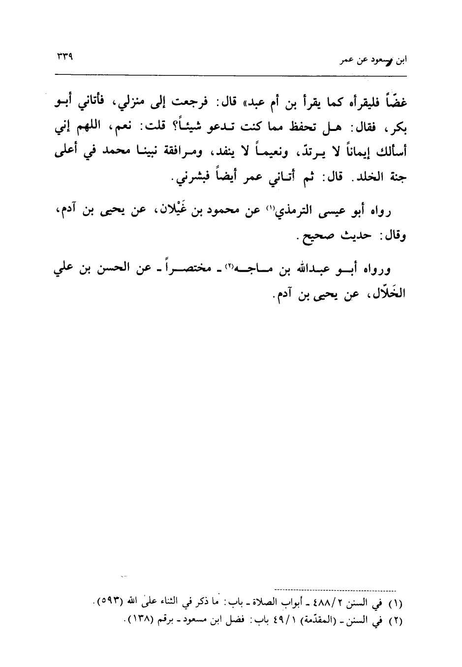 رَوَاهُ أَبُو عِيسَى التِّرْمِذِيُّ عَنْ مَحْمُودِ بْنِ غَيْلانَ عَنْ يَحْيَى بْنِ آدم وَقَالَ حَدِيث صَحِيح وَرَوَاهُ أَبُو عبد الله بْنُ مَاجَهْ مُخْتَصَرًا عَنِ الْحَسَنِ بْنِ عَلِيٍّ الْخلال عَن يحيى بن آدم (إِسْنَاده حسن)