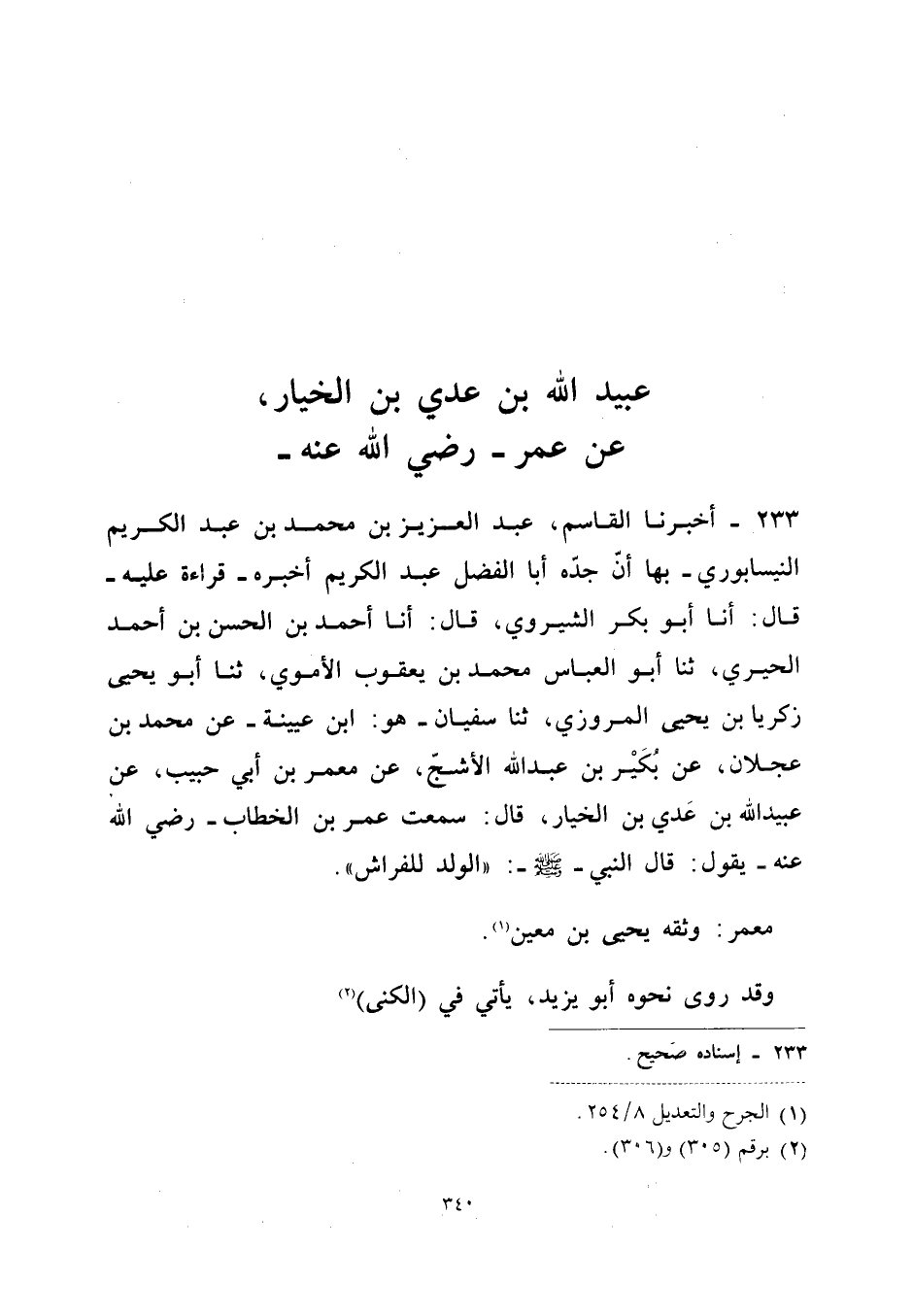 233 - أخبرنَا الْقَاسِم عبد الْعَزِيز بن مُحَمَّد بن عبد الْكَرِيم النَّيْسَابُورِي بهَا أَن جده أَبَا الْفضل عبد الْكَرِيم أَخْبَرَهُ قِرَاءَةً عَلَيْهِ قَالَ أَنا أَبُو بَكْرٍ الشِّيرَوِيُّ قَالَ أَنا أَحْمَدُ بْنُ الْحَسَنِ بْنِ أَحْمَدَ الْحِيرِيُّ ثَنَا أَبُو الْعَبَّاسِ مُحَمَّدُ بْنُ يَعْقُوبَ الأُمَوِيُّ ثَنَا أَبُو يَحْيَى زَكَرِيَّا بْنُ يَحْيَى الْمَرْوَزِيُّ ثَنَا سُفْيَانُ هُوَ ابْنُ عُيَيْنَةَ عَنْ مُحَمَّدِ بْنِ عَجْلانَ عَنْ بُكَيْرِ بْنِ عبد الله الأَشَجِّ عَنْ مَعْمَرِ بْنِ أَبِي حَبِيبٍ عَنْ عبيد الله بْنِ عَدِيِّ بْنِ الْخَيَّارِ قَالَ سَمِعْتُ عُمَرَ بْنَ الْخَطَّابِ رَضِيَ اللَّهُ عَنْهُ يَقُولُ قَالَ النَّبِيُّ صَلَّى اللَّهُ عَلَيْهِ وَسَلَّمَ الْوَلَدُ لِلْفِرَاشِ