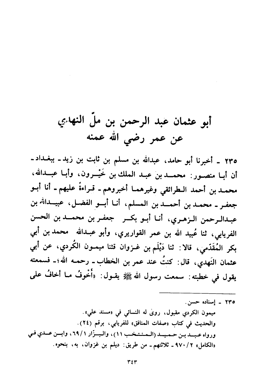 235 - أخبرنَا أَبُو حَامِد عبد الله بْنُ مُسْلِمِ بْنِ ثَابِتِ بْنِ زَيْدٍ بِبَغْدَادَ أَن أَبَا مَنْصُور مُحَمَّد بن عبد الْملك بن خيرون وَأَبا عبد الله مُحَمَّدَ بْنَ أَحْمَدَ الطَّرَائِقِيَّ وَغَيْرَهُمَا أَخْبَرُوهُمْ قِرَاءَةً عَلَيْهِمْ أَنا أَبُو جَعْفَرٍ مُحَمَّدُ بْنُ أَحْمَدَ بن الْمُسلم أَنا أَبُو الْفضل عبيد الله بن عبد الرَّحْمَن الزُّهْرِيُّ أَنا أَبُو بَكْرٍ جَعْفَرُ بْنُ مُحَمَّدِ بن الْحسن الْفرْيَابِيّ ثَنَا عبيد الله بن عمر القواريري وَأَبُو عبد الله مُحَمَّدُ بْنُ أَبِي بَكْرٍ الْمُقَدِّمِيُّ قَالا ثَنَا دَيْلَمُ بْنُ غَزْوَانَ قثنا مَيْمُونٌ الْكُرْدِيُّ عَنْ أَبِي عُثْمَانَ النَّهْدِيِّ قَالَ كُنْتُ عِنْدَ عُمَرَ بْنِ الْخَطَّابِ رَحِمَهُ اللَّهُ فَسَمِعْتُهُ يَقُولُ فِي خُطْبَتِهِ سَمِعْتُ رَسُولَ اللَّهِ صَلَّى اللَّهُ عَلَيْهِ وَسَلَّمَ يَقُولُ أَخْوَفُ مَا أَخَافُ عَلَى