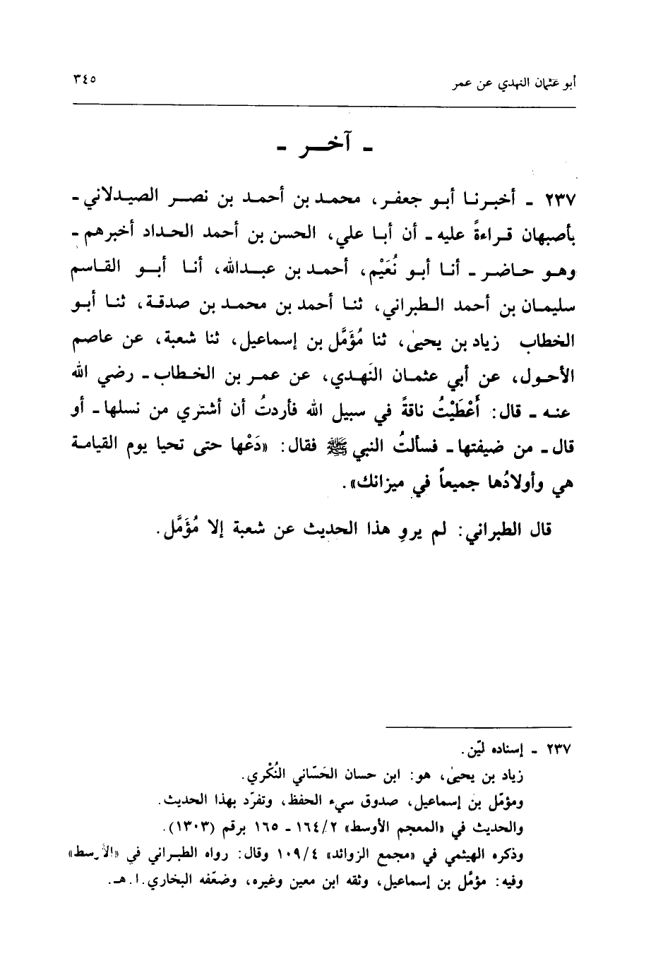 237 - أَخْبَرَنَا أَبُو جَعْفَرٍ مُحَمَّدُ بْنُ أَحْمَدَ بْنِ نَصْرٍ الصَّيْدَلانِيُّ بِأَصْبَهَانَ قِرَاءَةً عَلَيْهِ أَنَّ أَبَا عَلِيٍّ الْحَسَنَ بْنَ أَحْمَدَ الْحَدَّادَ أَخْبَرَهُمْ وَهُوَ حَاضِرٌ أَنا أَبُو نُعَيْمٍ أَحْمَدُ بْنُ عبد الله أَنا أَبُو الْقَاسِمِ سُلَيْمَانُ بْنُ أَحْمَدَ الطَّبَرَانِيُّ ثَنَا أَحْمَدُ بْنُ مُحَمَّدِ بْنِ صَدَقَةَ ثَنَا أَبُو الْخَطَّابِ زِيَادُ بْنُ يَحْيَى ثَنَا مُؤَمَّلُ بْنُ إِسْمَاعِيلَ ثَنَا شُعْبَةُ عَنْ عَاصِمٍ الأَحْوَلِ عَنْ أَبِي عُثْمَانَ النَّهْدِيِّ عَنْ عُمَرَ بْنِ الْخَطَّاب رَضِيَ اللَّهُ عَنْهُ قَالَ أُعْطِيتُ نَاقَةً فِي سَبِيلِ اللَّهِ فَأَرَدْتُ أَنْ أَشْتَرِيَ مِنْ نَسْلِهَا أَوْ قَالَ مِنْ ضَيْفَتِهَا فَسَأَلْتُ النَّبِيَّ صَلَّى اللَّهُ عَلَيْهِ وَسَلَّمَ فَقَالَ دَعْهَا حَتَّى تَحْيَا يَوْمَ الْقِيَامَةِ هِيَ وَأَوْلادُهَا جَمِيعًا فِي مِيزَانِكَ
