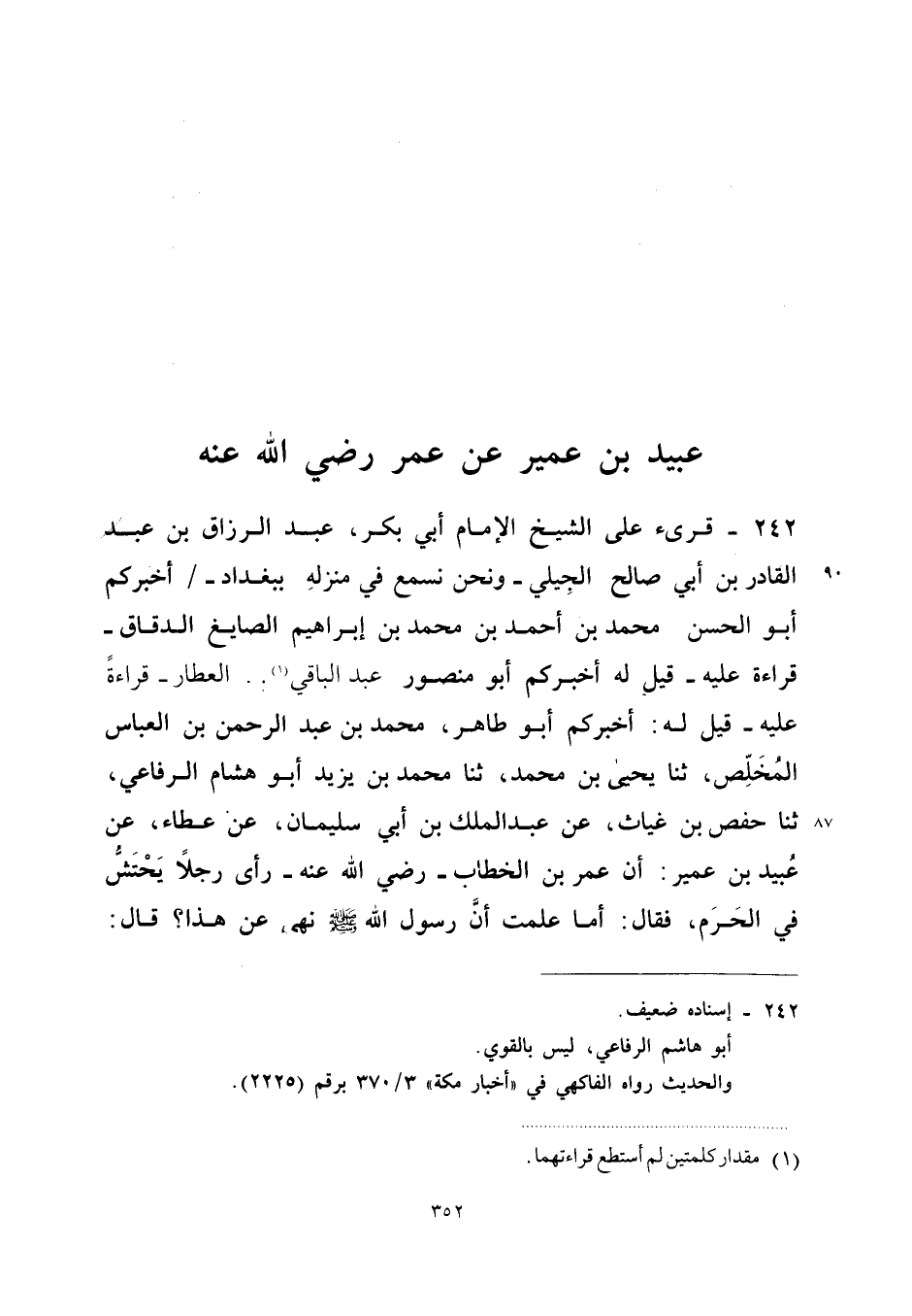 242 - قُرِئَ عَلَى الشَّيْخِ الإِمَامِ أَبِي بَكْرٍ عبد الرَّزَّاق بن عبد الْقَادِر بْنِ أَبِي صَالِحٍ الْجِيلِيِّ وَنَحْنُ نَسْمَعُ فِي مَنْزِلِهِ بِبَغْدَادَ أَخْبَرَكُمْ أَبُو الْحَسَنِ مُحَمَّدُ بْنُ أَحْمَدَ بْنِ مُحَمَّدِ بْنِ إِبْرَاهِيمَ الصَّايِغُ الدَّقَّاقُ قِرَاءَةً عَلَيْهِ قِيلَ لَهُ أَخْبَرَكُمْ أَبُو مَنْصُورٍ عبد الْبَاقِي الْعَطَّارُ قِرَاءَةً عَلَيْهِ قِيلَ لَهُ أَخْبَرَكُمْ أَبُو طَاهِر مُحَمَّد بن عبد الرَّحْمَن بْنِ الْعَبَّاسِ الْمُخَلِّصُ ثَنَا يَحْيَى بْنُ مُحَمَّدٍ ثَنَا مُحَمَّدُ بْنُ يَزِيدَ أَبُو هِشَامٍ الرِّفَاعِيُّ ثَنَا حَفْص بن غياث عَن عبد الْملك بْنِ أَبِي سُلَيْمَانَ عَنْ عَطَاءٍ عَنْ عُبَيْدِ بْنِ عُمَيْرٍ أَنَّ عُمَرَ بْنَ الْخَطَّابِ رَضِيَ اللَّهُ عَنْهُ رَأَى رَجُلا يَحْتَشُّ فِي الْحَرَمِ فَقَالَ أَمَا عَلِمْتَ أَنَّ رَسُولَ اللَّهِ صَلَّى اللَّهُ عَلَيْهِ وَسَلَّمَ نَهَى عَنْ هَذَا قَالَ