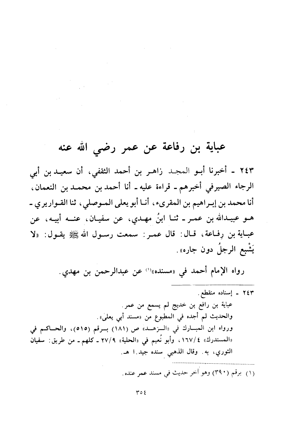 243 - أَخْبَرَنَا أَبُو الْمَجْدِ زَاهِرُ بْنُ أَحْمَدَ الثَّقَفِيُّ أَنَّ سَعِيدَ بْنَ أَبِي الرَّجَاءِ الصَّيْرَفِيَّ أَخْبَرَهُمْ قِرَاءَةً عَلَيْهِ أَنا أَحْمَدُ بْنُ مُحَمَّدِ بْنِ النُّعْمَانِ أَنَا مُحَمَّدُ بْنُ إِبْرَاهِيمَ بْنِ الْمُقْرِئِ أَنا أَبُو يَعْلَى الْمَوْصِلِيُّ ثَنَا الْقَوَارِيرِيُّ هُوَ عبيد الله بْنُ عُمَرَ ثَنَا ابْنُ مَهْدِيٍّ عَنْ سُفْيَانَ عَنهُ أَبِيهِ عَنْ عَبَايَةَ بْنِ رِفَاعَةَ قَالَ قَالَ عُمَرُ سَمِعْتُ رَسُولَ اللَّهِ صَلَّى اللَّهُ عَلَيْهِ وَسَلَّمَ يَقُولُ لَا يَشْبَعِ الرَّجُلُ دُونَ جَارِهِ
