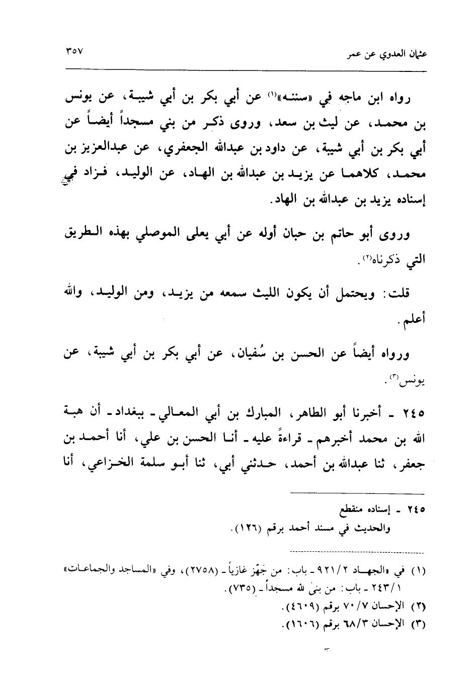 رَوَاهُ ابْنُ مَاجَهْ فِي سُنَنِهِ عَنْ أَبِي بَكْرِ بْنِ أَبِي شَيْبَةَ عَنْ يُونُسَ بْنِ مُحَمَّدٍ عَنْ لَيْثِ بْنِ سَعْدٍ وَرَوَى ذِكْرَ مَنْ بَنَى مَسْجِدًا أَيْضًا عَنْ أَبِي بَكْرِ بن أبي شيبَة عَن دَاوُد بن عبد الله الْجَعْفَرِي عَن عبد الْعَزِيز بن مُحَمَّد كِلَاهُمَا عَن يزِيد بن عبد الله بْنِ الْهَادِ عَنِ الْوَلِيدِ فَزَادَ فِي إِسْنَادِهِ يزِيد بن عبد الله بْنِ الْهَادِ وَرَوَى أَبُو حَاتِمِ بْنُ حِبَّانَ أَوَّلَهُ عَنْ أَبِي يَعْلَى الْمَوْصِلِيِّ بِهَذِهِ الطَّرِيقِ الَّتِي ذَكَرْنَاهُ قُلْتُ وَيُحْتَمَلُ أَنْ يَكُونَ اللَّيْثُ سَمِعَهُ مِنْ يَزِيدَ وَمِنَ الْوَلِيدِ وَاللَّهُ أَعْلَمُ وَرَوَاهُ أَيْضًا عَنِ الْحَسَنِ بْنِ سُفْيَانَ عَنْ أَبِي بَكْرِ بْنِ أَبِي شَيْبَةَ عَنْ يُونُسَ (إِسْنَاده مُنْقَطع)