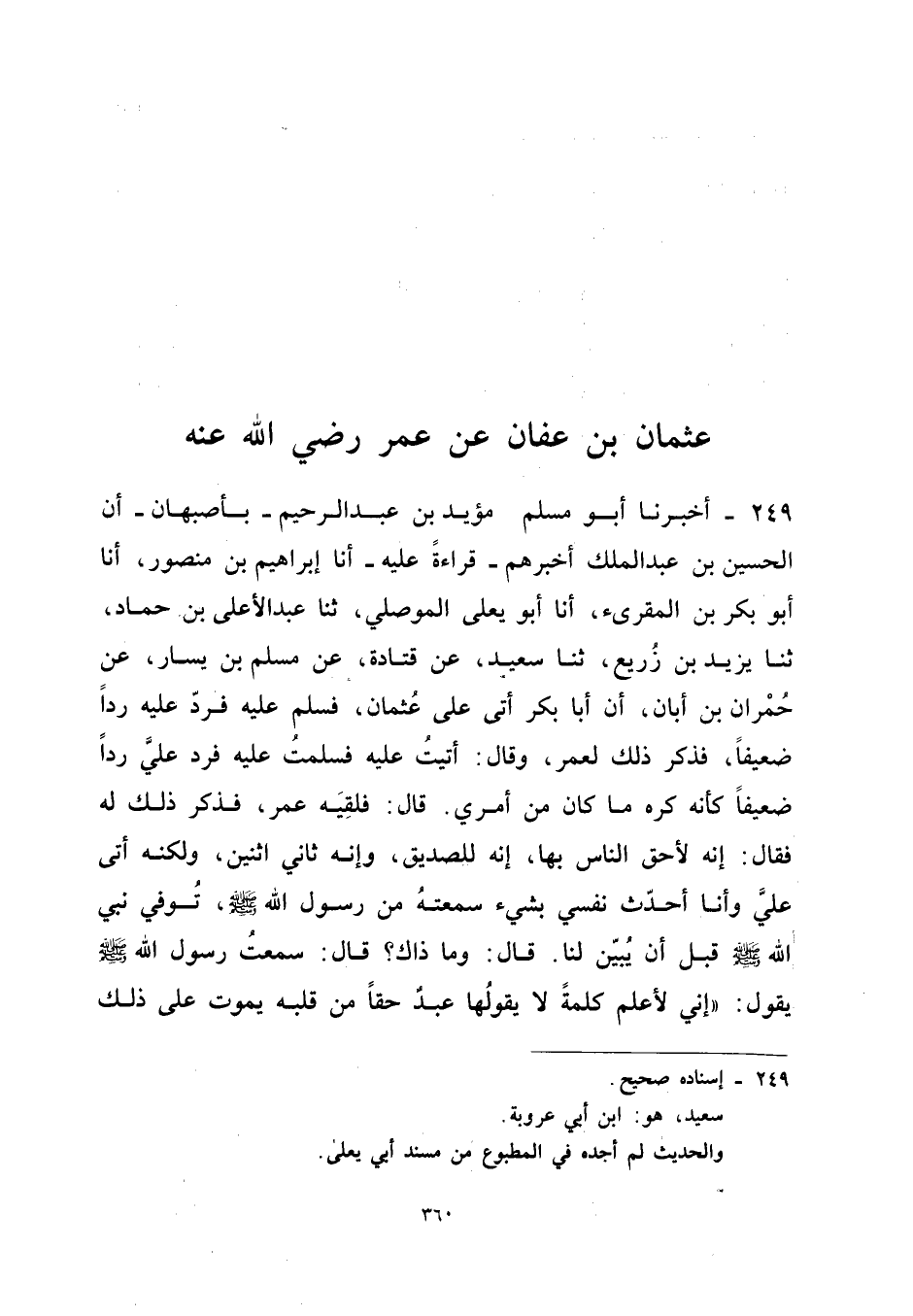 249 - أخبرنَا أَبُو مُسلم مؤيد بن عبد الرَّحِيم بأصبهان أَن الْحُسَيْن بن عبد الْملك أَخْبَرَهُمْ قِرَاءَةً عَلَيْهِ أَنا إِبْرَاهِيمُ بْنُ مَنْصُورٍ أَنا أَبُو بكر بن الْمُقْرِئ أَنا أَبُو يعلى الْموصِلِي ثَنَا عبد الْأَعْلَى بْنُ حَمَّادٍ ثَنَا يَزِيدُ بْنُ زُرَيْعٍ ثَنَا سَعِيدٌ عَنْ قَتَادَةَ عَنْ مُسْلِمِ بْنِ يَسَارٍ عَنْ حُمْرَانَ بْنِ أَبَانٍ أَنَّ أَبَا بَكْرٍ أَتَى عَلَى عُثْمَانَ فَسَلَّمَ عَلَيْهِ فَرَدَّ عَلَيْهِ رَدًّا ضَعِيفًا فَذَكَرَ ذَلِكَ لِعُمَرَ وَقَالَ أَتَيْتُ عَلَيْهِ فَسَلَّمْتُ عَلَيْهِ فَرَدَّ عَلَيَّ رَدًّا ضَعِيفًا كَأَنَّهُ كَرِهَ مَا كَانَ مِنْ أَمْرِي قَالَ فَلَقِيَهُ عُمَرُ فَذَكَرَ ذَلِكَ لَهُ فَقَالَ إِنَّهُ لأَحَقُّ النَّاسِ بِهَا إِنَّهُ لَلصِّدِّيقُ وَإِنَّهُ ثَانِيَ اثْنَيْنِ وَلَكِنَّهُ أَتَى عَلَيَّ وَأَنَا أُحَدِّثُ نَفْسِي بِشَيْءٍ سَمِعْتُهُ مِنْ رَسُولِ اللَّهِ صَلَّى اللَّهُ عَلَيْهِ وَسَلَّمَ تُوُفِّيَ نَبِيُّ اللَّهِ صَلَّى اللَّهُ عَلَيْهِ وَسَلَّمَ قَبْلَ أَنْ يُبَيِّنَ لَنَا قَالَ وَمَا ذَاكَ قَالَ سَمِعْتُ رَسُولَ اللَّهِ صَلَّى اللَّهُ عَلَيْهِ وَسَلَّمَ يَقُولُ إِنِّي لأَعْلَمُ كَلِمَةً لَا يَقُولُهَا عَبْدٌ حَقًّا مِنْ قَلْبِهِ يَمُوتُ على ذَلِك