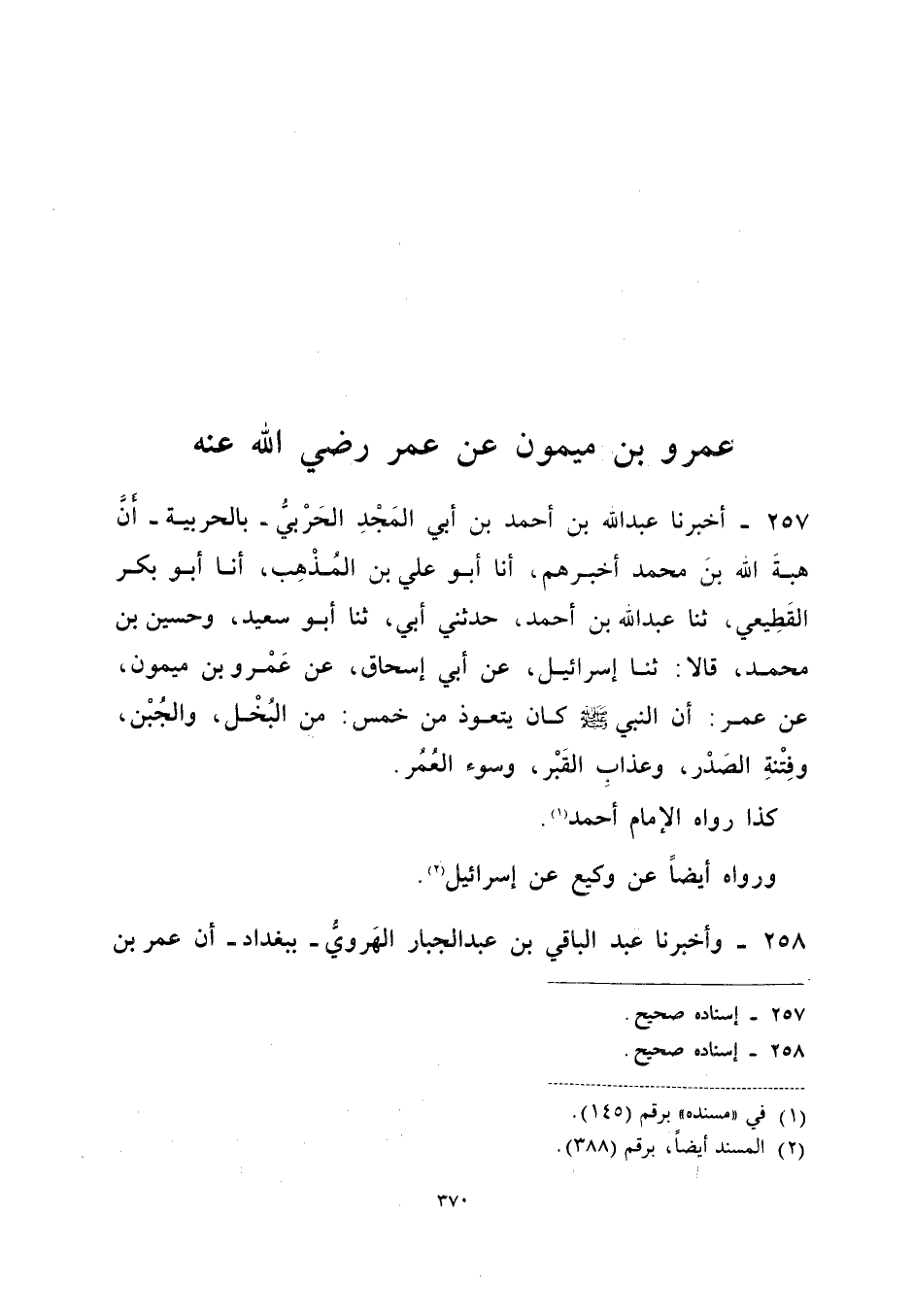 258 - وَأخْبرنَا عبد الْبَاقِي بن عبد الْجَبَّار الْهَرَوِيُّ بِبَغْدَادَ أَنَّ عُمَرَ بْنَ مُحَمَّدٍ الْبَسْطَامِيَّ أَخْبَرَهُمْ قِرَاءَةً عَلَيْهِ أَنا أَحْمَدُ بْنُ مُحَمَّدِ بْنِ مُحَمَّدٍ الْخَلِيلِيُّ أَنا عَلِيُّ بْنُ أَحْمَدَ بْنِ مُحَمَّدٍ الْخُزَاعِيُّ أَنا الْهَيْثَمُ بْنُ كُلَيْبٍ الشَّاشِيُّ ثَنَا عِيسَى بْنُ أَحْمَدَ الْعَسْقَلانِيُّ ثَنَا مُصْعَبُ بْنُ الْمِقْدَامِ ثَنَا إِسْرَائِيلُ عَنْ أَبِي إِسْحَاقَ عَنْ عَمْرِو بْنِ مَيْمُونٍ عَنْ عُمَرَ إِنَّ النَّبِيَّ صَلَّى اللَّهُ عَلَيْهِ وَسَلَّمَ كَانَ يَتَعَوَّذُ مِنَ الْخَمسِ مِنَ الْجُبْنِ وَالْبُخْلِ وَسُوءِ الْعُمر وفتنة الصَّدْر وَعَذَاب الْقَبْر (إِسْنَاده صَحِيح)