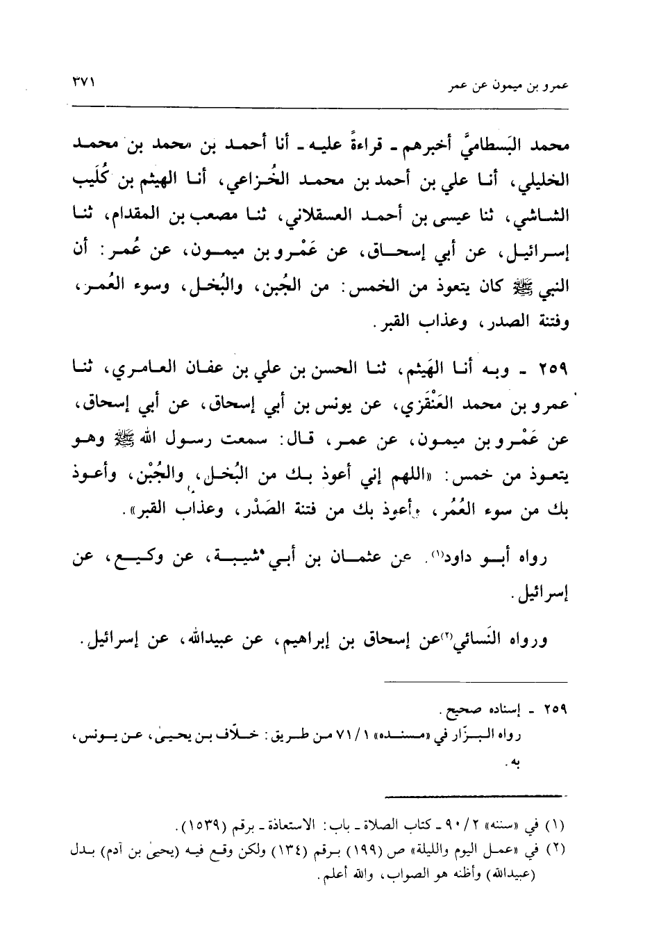 259 - وَبِهِ أَنا الْهَيْثَمُ ثَنَا الْحَسَنُ بْنُ عَلِيِّ بْنِ عَفَّانَ الْعَامِرِيُّ ثَنَا عَمْرُو بْنُ مُحَمَّدٍ الْعَنْقَزِيُّ عَنْ يُونُسَ بْنِ أَبِي إِسْحَاقَ عَنْ أَبِي إِسْحَاقَ عَنْ عَمْرِو بْنِ مَيْمُونٍ عَنْ عُمَرَ قَالَ سَمِعْتُ رَسُولَ اللَّهِ صَلَّى اللَّهُ عَلَيْهِ وَسَلَّمَ وَهُوَ يَتَعَوَّذُ مِنْ خَمْسٍ اللَّهُمَّ إِنِّي أَعُوذُ بِكَ مِنَ الْبُخْلِ وَالْجُبْنِ وَأَعُوذُ بِكَ مِنْ سُوءِ الْعُمُرِ وَأَعُوذُ بِكَ مِنْ فِتْنَةِ الصَّدْرِ وَعَذَابِ الْقَبْرِ