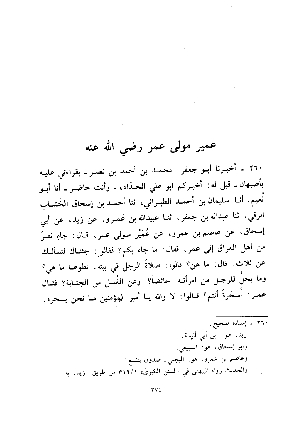 260 - أَخْبَرَنَا أَبُو جَعْفَرٍ مُحَمَّدُ بْنُ أَحْمَدَ بْنِ نَصْرٍ بِقِرَاءَتِي عَلَيْهِ بِأَصْبَهَانَ قِيلَ لَهُ أَخْبَرَكُمْ أَبُو عَلِيٍّ الْحَدَّادُ وَأَنْتَ حَاضِرٌ أَنا أَبُو نُعَيْمٍ أَنا سُلَيْمَانُ بْنُ أَحْمَدَ الطَّبَرَانِيُّ ثَنَا أَحْمَدُ بن إِسْحَاق الخشاب الرقي ثَنَا عبد الله بن جَعْفَر ثَنَا عبيد الله بْنُ عَمْرٍو عَنْ زَيْدٍ عَنْ أَبِي إِسْحَاقَ عَنْ عَاصِمِ بْنِ عَمْرٍو عَنْ عُمَيْرٍ مَوْلَى عُمَرَ قَالَ جَاءَ نَفَرٌ مِنْ أَهْلِ الْعِرَاقِ إِلَى عُمَرَ فَقَالَ مَا جَاءَ بِكُمْ فَقَالُوا جِئْنَاكَ لِنَسْأَلَكَ عَنْ ثَلاثٍ قَالَ مَا هُنَّ قَالُوا صَلاةُ الرَّجُلِ فِي بَيْتِهِ تَطَوُّعًا مَا هِيَ وَمَا يَحِلُّ لِلرَّجُلِ مِنِ امْرَأَتِهِ حَائِضًا وَعَنِ الْغُسْلِ مِنَ الْجَنَابَةِ فَقَالَ عُمَرُ أَسَحَرَةٌ أَنْتُمْ قَالُوا لَا وَاللَّهِ يَا أَمِيرَ الْمُؤْمِنِينَ مَا نَحْنُ بِسَحَرَةٍ