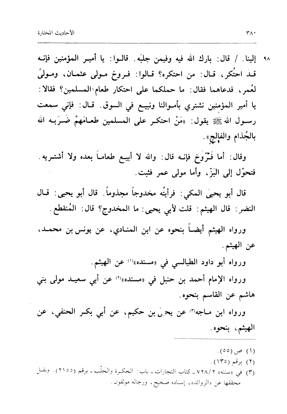 قَالَ أَبُو يَحْيَى الْمَكِّيُّ فَرَأَيْتُهُ مَخْدُوجًا مَجْذُومًا قَالَ أَبُو يَحْيَى قَالَ النَّضْرُ قَالَ الْهَيْثَمُ قُلْتُ لأَبِي يَحْيَى مَا الْمَخْدُوجُ قَالَ الْمُنْقَطِعُ وَرَوَاهُ الْهَيْثَمُ أَيْضًا بِنَحْوِهِ عَنِ ابْنِ الْمُنَادِي عَنْ يُونُسَ بْنِ مُحَمَّدٍ عَنِ الْهَيْثَمِ وَرَوَاهُ أَبُو دَاوُدَ الطَّيَالِسِيُّ فِي مُسْنَدِهِ عَنِ الْهَيْثَمِ وَرَوَاهُ الإِمَامُ أَحْمَدُ بْنُ حَنْبَلٍ فِي مُسْنَدِهِ عَنْ أَبِي سَعِيدٍ مَوْلَى بَنِي هَاشِمٍ عَنِ الْقَاسِمِ بِنَحْوِهِ وَرَوَاهُ ابْنُ مَاجَهْ عَنْ يَحْيَى بْنِ حَكِيمٍ عَنْ أَبِي بَكْرٍ الْحَنَفِيِّ عَن الْهَيْثَم بِنَحْوِهِ (إِسْنَاده حسن)