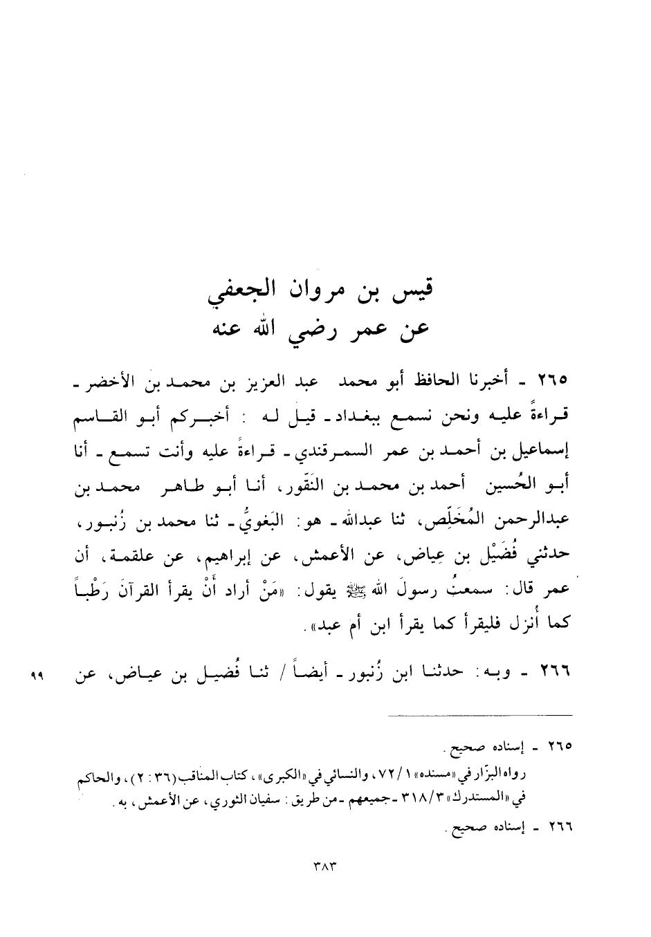 265 - أخبرنَا الْحَافِظ أَبُو مُحَمَّد عبد الْعَزِيز بْنُ مُحَمَّدِ بْنِ الأَخْضَرِ قِرَاءَةً عَلَيْهِ وَنَحْنُ نَسْمَعُ بِبَغْدَادَ قِيلَ لَهُ أَخْبَرَكُمْ أَبُو الْقَاسِمِ إِسْمَاعِيلُ بْنُ أَحْمَدَ بْنِ عُمَرَ السَّمَرْقَنْدِيُّ قِرَاءَةً عَلَيْهِ وَأَنْتَ تَسْمَعُ أَنَا أَبُو الْحُسَيْنِ أَحْمَدُ بْنُ مُحَمَّدِ بْنِ النَّقُورِ أَنا أَبُو طَاهِرٍ مُحَمَّد بن عبد الرَّحْمَن المخلص ثَنَا عبد الله هُوَ الْبَغَوِيُّ ثَنَا مُحَمَّدُ بْنُ زُنْبُورٍ حَدَّثَنِي فُضَيْلُ بْنُ عِيَاضٍ عَنِ الأَعْمَشِ عَنْ إِبْرَاهِيمَ عَنْ عَلْقَمَةَ أَنَّ عُمَرَ قَالَ سَمِعْتُ رَسُولَ اللَّهِ صَلَّى اللَّهُ عَلَيْهِ وَسَلَّمَ يَقُولُ مَنْ أَرَادَ أَنْ يَقْرَأَ الْقُرْآنَ رَطِبًا كَمَا أُنْزِلَ فليقرأ كَمَا يقْرَأ ابْن أم عبد (إِسْنَاده صَحِيح)