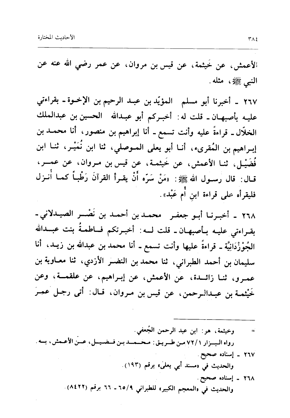 267 - أخبرنَا أَبُو مُسلم الْمُؤَيد بن عبد الرَّحِيم بْنِ الإِخْوَةِ بِقِرَاءَتِي عَلَيْهِ بِأَصْبَهَانَ قُلْتُ لَهُ أخْبركُم أَبُو عبد الله الْحُسَيْن بن عبد الْملك الْخَلالُ قِرَاءَةً عَلَيْهِ وَأَنْتَ تَسْمَعُ أَنَا إِبْرَاهِيمُ بْنُ مَنْصُورٍ أَنا مُحَمَّدُ بْنُ إِبْرَاهِيمَ بْنِ الْمُقْرِئ أَنا أَبُو يَعْلَى الْمَوْصِلِيُّ ثَنَا ابْنُ نُمَيْرٍ ثَنَا ابْنُ فُضَيْلٍ ثَنَا الأَعْمَشُ عَنْ خَيْثَمَةَ عَنْ قَيْسِ بْنِ مَرْوَانَ عَنْ عُمَرَ قَالَ قَالَ رَسُولُ اللَّهِ صَلَّى اللَّهُ عَلَيْهِ وَسَلَّمَ مَنْ سَرَّهُ أَنْ يَقْرَأَ الْقُرْآنَ رَطِبًا كَمَا أُنْزِلَ فَلْيَقْرَأْهُ عَلَى قِرَاءَةِ ابْنِ أُمِّ عَبْدٍ (إِسْنَاده صَحِيح)