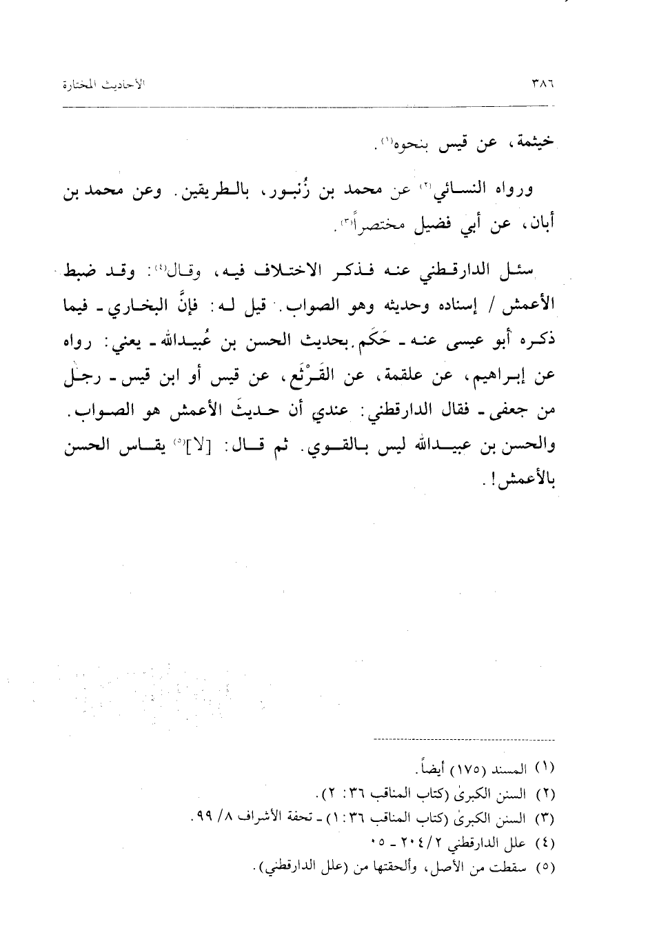 خَيْثَمَةَ عَنْ قَيْسٍ بِنَحْوِهِ وَرَوَاهُ النَّسَائِيُّ عَنْ مُحَمَّدِ بْنِ زُنْبُورٍ بِالطَّرِيقَيْنِ وَعَنْ مُحَمَّدِ بْنِ أَبَانٍ عَنْ أَبِي فُضَيْلٍ مُخْتَصَرًا سُئِلَ الدَّارَقُطْنِيُّ عَنْهُ فَذَكَرَ الاخْتِلافَ فِيهِ وَقَالَ وَقَدْ ضَبَطَ الأَعْمَشُ إِسْنَادَهُ وَحِديَثُه وَهُوَ الصَّوَابُ قِيلَ لَهُ فَإِنَّ الْبُخَارِيَّ فِيمَا ذَكَرَهُ أَبُو عِيسَى عَنْهُ حكم بِحَدِيث الْحسن بن عبيد الله يَعْنِي رَوَاهُ عَنْ إِبْرَاهِيمَ عَنْ عَلْقَمَةَ عَنِ الْقَرْثَعِ عَنْ قَيْسٍ أَوِ ابْنِ قَيْسٍ رَجُلٍ مِنْ جُعْفِيٍّ فَقَالَ الدَّارَقُطْنِيُّ عِنْدِي أَنَّ حَدِيثَ الْأَعْمَش هُوَ الصَّوَاب وَالْحسن بن عبيد الله لَيْسَ بِالْقَوِيِّ ثُمَّ قَالَ (لَا) يُقَاسُ الْحَسَنُ بالأعمش (إِسْنَاده صَحِيح)