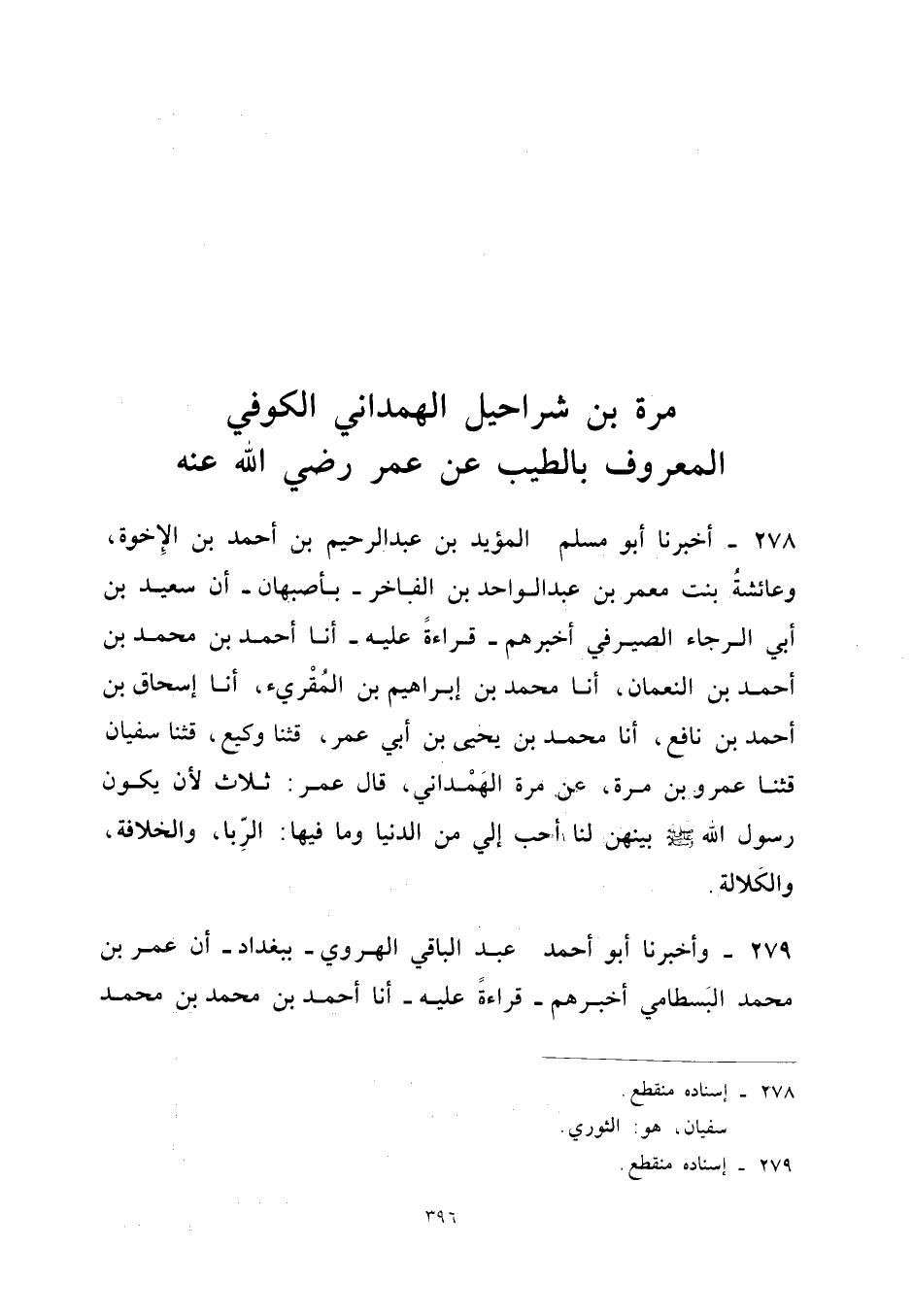 278 - أَخْبَرَنَا أَبُو مُسلم الْمُؤَيد بن عبد الرَّحِيم بْنِ أَحْمَدَ بْنِ الإِخْوَةِ وَعَائِشَةُ بِنْتُ مَعْمَرِ بن عبد الْوَاحِد بْنِ الْفَاخِرِ بِأَصْبَهَانَ أَنَّ سَعِيدَ بْنَ أَبِي الرَّجَاءِ الصَّيْرَفِيَّ أَخْبَرَهُمْ قِرَاءَةً عَلَيْهِ أَنا أَحْمَدُ بْنُ مُحَمَّدِ بْنِ أَحْمَدَ بْنِ النُّعْمَانِ أَنا مُحَمَّد بن إِبْرَاهِيم بن الْمُقْرِئِ أَنا إِسْحَاقُ بْنُ أَحْمَدَ بْنِ نَافِعٍ أَنا مُحَمَّدُ بْنُ يَحْيَى بْنِ أَبِي عُمَرَ قثنا وَكِيعٌ قثنا سُفْيَانُ قَثنا عَمْرُو بْنُ مُرَّةَ عَنْ مُرَّةَ الْهَمْدَانِيِّ قَالَ عُمَرُ ثَلاثٌ لأَنْ يَكُونَ رَسُولُ اللَّهِ صَلَّى اللَّهُ عَلَيْهِ وَسَلَّمَ بَيَّنَهُنَّ لَنَا أَحَبُّ إِلَيَّ مِنَ الدُّنْيَا وَمَا فِيهَا الرِّبَا والخلافة والكلالة (إِسْنَاده مُنْقَطع)