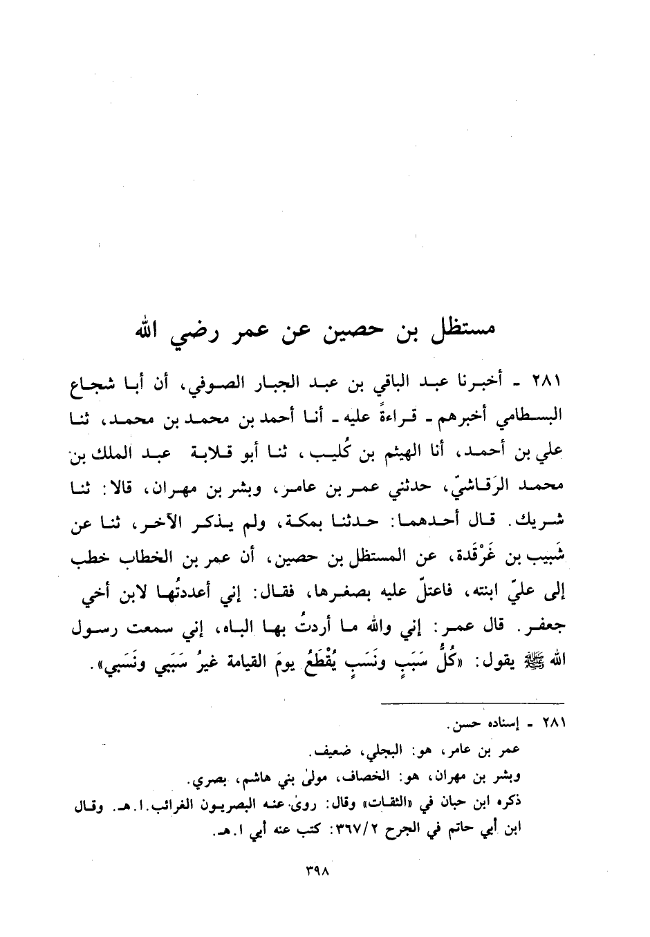 281 - أخبرنَا عبد الْبَاقِي بن عبد الْجَبَّار الصُّوفِيُّ أَنَّ أَبَا شُجَاعٍ الْبَسْطَامِيَّ أَخْبَرَهُمْ قِرَاءَةً عَلَيْهِ أَنا أَحْمَدُ بْنُ مُحَمَّدِ بْنِ مُحَمَّدٍ ثَنَا عَلِيُّ بْنُ أَحْمَدَ أَنا الْهَيْثَمُ بْنُ كُلَيْب ثَنَا أَبُو قلَابَة عبد الْملك بْنُ مُحَمَّدٍ الرَّقَاشِيُّ حَدَّثَنِي عُمَرُ بْنُ عَامِرٍ وَبِشْرُ بْنُ مِهْرَانَ قَالا ثَنَا شَرِيكٌ قَالَ أَحَدُهُمَا حَدَّثَنَا بِمَكَّةَ وَلَمْ يَذْكُرِ الآخَرَ ثَنَا عَنْ شَبِيبِ بْنِ غَرْقَدَةَ عَنِ الْمُسْتَظِلِّ بْنِ حُصَيْنٍ أَنَّ عُمَر بْنَ الْخَطَّابِ خَطَبَ إِلَى عَلِيٍّ ابْنَتَهُ فَاعْتَلَّ عَلَيْهِ بِصِغَرِهَا فَقَالَ إِنِّي أَعْدَدْتُهَا لابْنِ أَخِي جَعْفَرٍ قَالَ عُمَرُ إِنِّي وَاللَّهِ مَا أَرَدْتُ بِهَا الْبَاهَ إِنِّي سَمِعْتُ رَسُولَ اللَّهِ صَلَّى اللَّهُ عَلَيْهِ وَسَلَّمَ يَقُولُ كُلُّ سَبَبٍ وَنَسَبٍ يُقْطَعُ يَوْمَ الْقِيَامَةِ غَيْرَ سببي ونسبي (إِسْنَاده حسن)