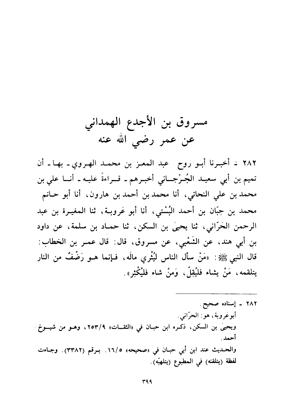 282 - أخبرنَا أَبُو روح عبد الْمعز بْنُ مُحَمَّدٍ الْهَرَوِيُّ بِهَا أَنَّ تَمِيمَ بْنَ أَبِي سَعِيدٍ الْجُرْجَانِيَّ أَخْبَرَهُمْ قِرَاءَةً عَلَيْهِ أَنا عَلِيُّ بْنُ مُحَمَّدِ بْنِ عَلِيٍّ النَّحَّاتِيُّ أَنا مُحَمَّدُ بْنُ أَحْمَدَ بْنِ هَارُونَ أَنا أَبُو حَاتِمٍ مُحَمَّدُ بْنُ حِبَّانَ بْنِ أَحْمَدَ الْبُسْتِيُّ أَنا أَبُو عرُوبَة ثَنَا الْمُغيرَة بن عبد الرَّحْمَن الْحَرَّانِيُّ ثَنَا يَحْيَى بْنُ السَّكَنِ ثَنَا حَمَّادُ بْنُ سَلَمَة عَنْ دَاوُدَ بْنِ أَبِي هِنْدٍ عَنِ الشَّعْبِيِّ عَنْ مَسْرُوقٍ قَالَ قَالَ عُمَرُ بْنُ الْخَطَّابِ قَالَ النَّبِيُّ صَلَّى اللَّهُ عَلَيْهِ وَسَلَّمَ مَنْ سَأَلَ النَّاسَ لِيُثْرِيَ مَالَهُ فَإِنَّمَا هُوَ رَضَفٌ مِنَ النَّارِ يَتَلَقَّمُهُ مَنْ يَشَاءُ فَلْيُقِلَّ وَمَنْ شَاءَ فَلْيُكْثِرْ