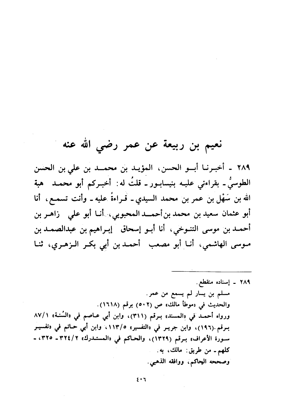 289 - أَخْبَرَنَا أَبُو الْحَسَنِ الْمُؤَيَّدُ بْنُ مُحَمَّدِ بْنِ عَلِيِّ بْنِ الْحَسَنِ الطُّوسِيُّ بِقِرَاءَتِي عَلَيْهِ بِنَيْسَابُورَ قُلْتُ لَهُ أَخْبَرَكُمْ أَبُو مُحَمَّدٍ هِبَةُ اللَّهِ بْنُ سَهْلِ بْنِ عُمَرَ بْنِ مُحَمَّدِ السَّيِّدِيُّ قِرَاءَةً عَلَيْهِ وَأَنْتَ تَسْمَعُ أَنا أَبُو عُثْمَانَ سَعِيدُ بْنُ مُحَمَّدِ بْنِ أَحْمَدَ الْمَحْبُوبِيُّ أَنا أَبُو عَلِيٍّ زَاهِرُ بْنُ أَحْمَدَ بْنِ مُوسَى التَّنُوخِيُّ أَنا أَبُو إِسْحَاقَ إِبْرَاهِيمُ بْنُ عبد الصَّمد بْنِ مُوسَى الْهَاشِمِيُّ أَنا أَبُو مُصْعَبٍ أَحْمَدُ بْنُ أَبِي بَكْرٍ الزُّهْرِيُّ ثَنَا