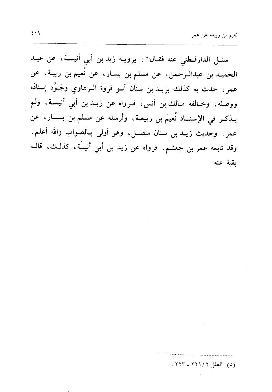 سُئِلَ الدَّارَقُطْنِيُّ عَنْهُ فَقَالَ يَرْوِيهِ زَيْدُ بْنُ أبي أنيسَة عَن عبد الحميد بن عبد الرَّحْمَن عَنْ مُسْلِمِ بْنِ يَسَارٍ عَنْ نُعَيْمِ بْنِ رَبِيعَةَ عَنْ عُمَرَ حَدَّثَ بِهِ كَذَلِكَ يَزِيدُ بْنُ سِنَانٍ أَبُو فَرْوَةَ الرَّهَاوِيُّ وَجَوَّدَ إِسْنَادَهُ وَوَصَلَهُ وَخَالَفَهُ مَالِكُ بْنُ أَنَسٍ فَرَوَاهُ عَنْ زَيْدِ بْنِ أَبِي أُنَيْسَةَ وَلَمْ يَذْكُرْ فِي الإِسْنَادِ نُعَيْمَ بْنَ رَبِيعَةَ وَأَرْسَلَهُ عَنْ مُسْلِمِ بْنِ يَسَارٍ عَنْ عُمَرَ وَحَدِيثُ زَيْدِ بْنِ سِنَانٍ مُتَّصِلٌ وَهُوَ أَوْلَى بِالصَّوَابِ وَاللَّهُ أَعْلَمُ وَقَدْ تَابَعَهُ عُمَرُ بْنُ جُعْشُمٍ فَرَوَاهُ عَنْ زَيْدِ بْنِ أَبِي أُنَيْسَةَ كَذَلِكَ قَالَهُ بَقِيَّةُ عَنهُ (إِسْنَاده حسن)