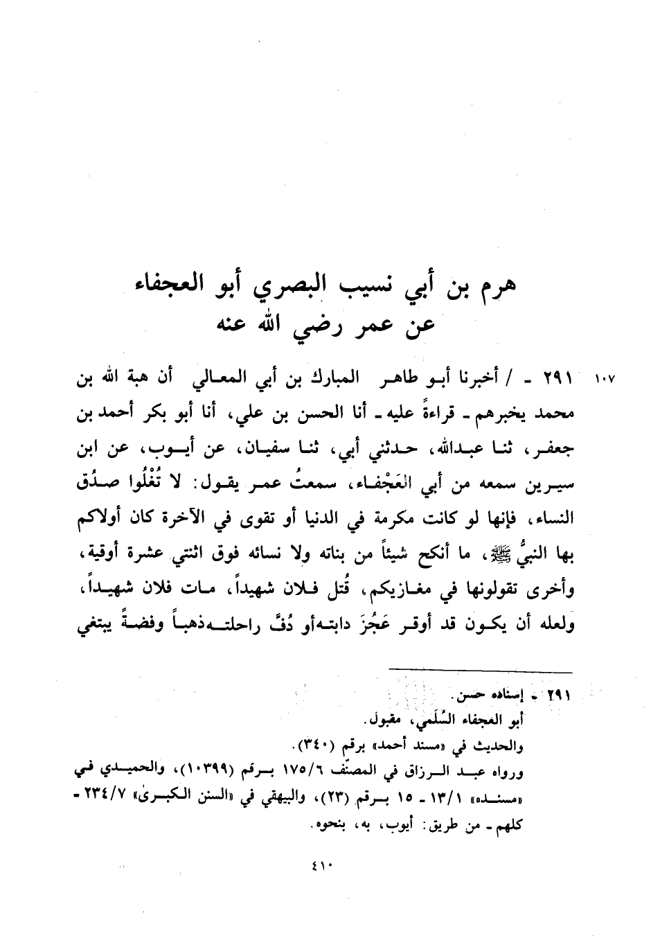 291 - أَخْبَرَنَا أَبُو طَاهِرٍ الْمُبَارَكُ بْنُ أَبِي الْمَعَالِي أَنَّ هِبَةَ الله بن مُحَمَّد يُخْبِرُهُمْ قِرَاءَةً عَلَيْهِ أَنا الْحَسَنُ بْنُ عَلِيٍّ أَنا أَبُو بَكْرٍ أَحْمَدُ بْنُ جَعْفَرٍ ثَنَا عبد الله حَدَّثَنِي أَبِي ثَنَا سُفْيَانُ عَنْ أَيُّوبَ عَنِ ابْنِ سِيرِينَ سَمِعَهُ مِنْ أَبِي الْعَجْفَاءِ سَمِعْتُ عُمَرَ يَقُولُ لَا تُغْلُوا صُدُقَ النِّسَاءِ فَإِنَّهَا لَوْ كَانَتْ مَكْرُمَةً فِي الدُّنْيَا أَوْ تَقْوًى فِي الآخِرَةِ كَانَ أَوْلاكُمْ بِهَا النَّبِيُّ صَلَّى اللَّهُ عَلَيْهِ وَسَلَّمَ مَا أَنْكَحَ شَيْئًا مِنْ بَنَاتِهِ وَلا نِسَائِهِ فَوْقَ اثْنَتَيْ عَشْرَةَ أُوقِيَّةً وَأُخْرَى تَقُولُونَهَا فِي مَغَازِيكُمْ قُتِلَ فُلانٌ شَهِيدًا مَاتَ فُلانٌ شَهِيدًا وَلَعَلَّهُ أَنْ يَكُونَ قَدْ أَوْقَرَ عَجُزَ دَابَّتِهِ أَوْ دُفَّ رَاحِلَتِهِ ذَهَبًا وَفِضة يَبْتَغِي