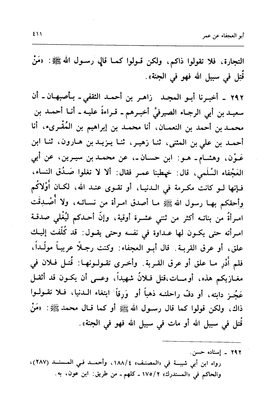 292 - أَخْبَرَنَا أَبُو الْمَجْدِ زَاهِرُ بْنُ أَحْمَدَ الثَّقَفِيُّ بِأَصْبَهَانَ أَنَّ سَعِيدَ بْنَ أَبِي الرَّجَاءِ الصَّيْرَفِيَّ أَخْبَرَهُمْ قِرَاءَةً عَلَيْهِ أَنا أَحْمَدُ بْنُ مُحَمَّدِ بْنِ أَحْمَدَ بْنِ النُّعْمَانِ أَنا مُحَمَّدُ بْنُ إِبْرَاهِيم بن المقرىء أَنا أَحْمَدُ بْنُ عَلِيِّ بْنِ الْمُثَنَّى ثَنَا زُهَيْرٌ ثَنَا يَزِيدُ بْنُ هَارُونَ ثَنَا ابْنُ عَوْنٍ وَهِشَامٌ هُوَ ابْنُ حَسَّانٍ عَنْ مُحَمَّدِ بْنِ سِيرِينَ عَنْ أَبِي الْعَجْفَاءِ السُّلَمِيِّ قَالَ خَطَبَنَا عُمَرُ فَقَالَ أَلا لَا تُغْلُوا صُدُقَ النِّسَاءِ فَإِنَّهَا لَوْ كَانَتْ مَكْرُمَةً فِي الدُّنْيَا أَوْ تَقْوًى عِنْدَ اللَّهِ لَكَانَ أَوْلاكُمْ وَأَحَقَّكُمْ بِهَا رَسُولُ اللَّهِ صَلَّى اللَّهُ عَلَيْهِ وَسَلَّمَ مَا أَصْدَقَ امْرَأَةً مِنْ نِسَائِهِ وَلا أُصْدِقَتِ امْرَأَةٌ مِنْ بَنَاتِهِ أَكْثَرَ مِنْ ثِنْتَيْ عَشْرَةَ أُوقِيَّةً وَإِنَّ أَحَدَكُمْ لَيُغْلِي صَدَقَةَ امْرَأَتِهِ حَتَّى يَكُونَ لَهَا عَدَاوَةٌ فِي نَفْسِهِ وَحَتَّى يَقُولَ قَدْ كَلِفْتُ إِلَيْكِ عَلَقَ أَوْ عَرَقَ الْقِرْبَةِ قَالَ أَبُو الْعَجْفَاءِ وَكُنْتُ رَجُلا عَرَبِيًّا مُوَلَّدًا فَلَمْ أَدْرِ مَا عَلَقُ أَوْ عَرَقُ الْقِرْبَةِ وَأُخْرَى تَقُولُونَهَا قُتِلَ فُلانٌ فِي مَغَازِيكُمْ هَذِهِ أَوْ مَاتَ قُتِلَ فُلانٌ شَهِيدًا وَعَسَى أَنْ يَكُونَ قَدْ أَثْقَلَ عَجُزَ دَابَّتِهِ أَوْ دُفَّ رَاحِلَتِهِ ذَهَبًا أَوْ وَرِقًا ابْتِغَاءَ الدُّنْيَا فَلا تَقُولُوا ذَاكَ وَلَكِنْ قُولُوا كَمَا قَالَ رَسُولُ اللَّهِ صَلَّى اللَّهُ عَلَيْهِ وَسَلَّمَ أَوْ كَمَا قَالَ مُحَمَّدٌ صَلَّى اللَّهُ عَلَيْهِ وَسَلَّمَ مَنْ قُتِلَ فِي سَبِيلِ اللَّهِ أَوْ مَاتَ فِي سَبِيل الله فَهُوَ فِي الْجنَّة (إِسْنَاده حسن)