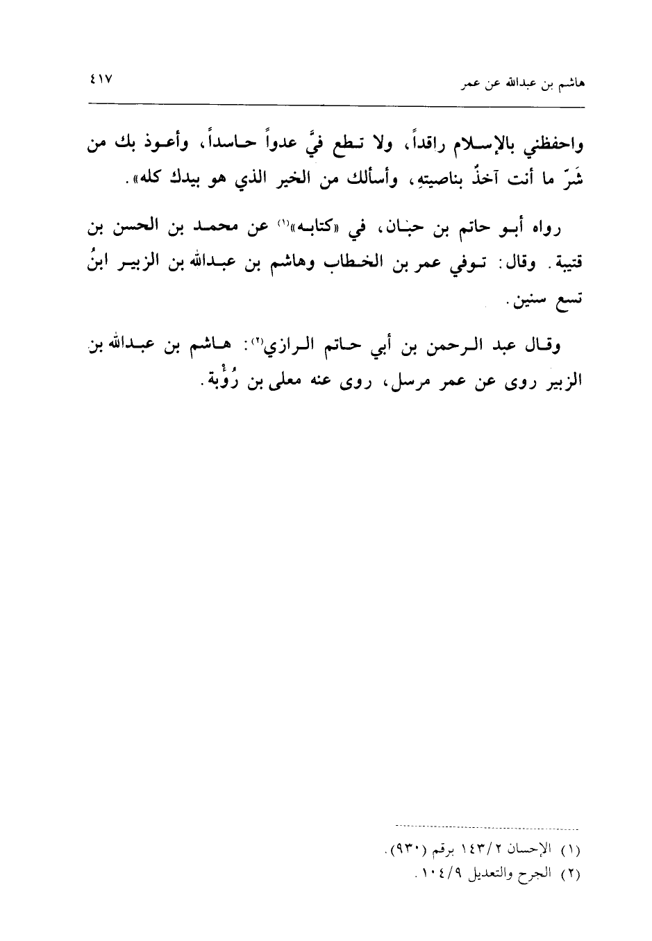 رَوَاهُ أَبُو حَاتِمِ بْنُ حِبَّانَ فِي كِتَابِهِ عَنْ مُحَمَّدِ بْنِ الْحَسَنِ بْنِ قُتَيْبَةَ وَقَالَ تُوُفِّيَ عُمَرُ بْنُ الْخَطَّابِ وَهَاشِمُ بن عبد الله بن الزبير ابْن تسع سِنِين وَقَالَ عبد الرَّحْمَن بن أبي حَاتِم الرَّازِيّ هَاشم بن عبد الله بْنِ الزُّبَيْرِ رَوَى عَنْ عُمَرَ مُرْسَلٌ رَوَى عَنهُ مُعلى بن رؤبة (إِسْنَاده مُنْقَطع)