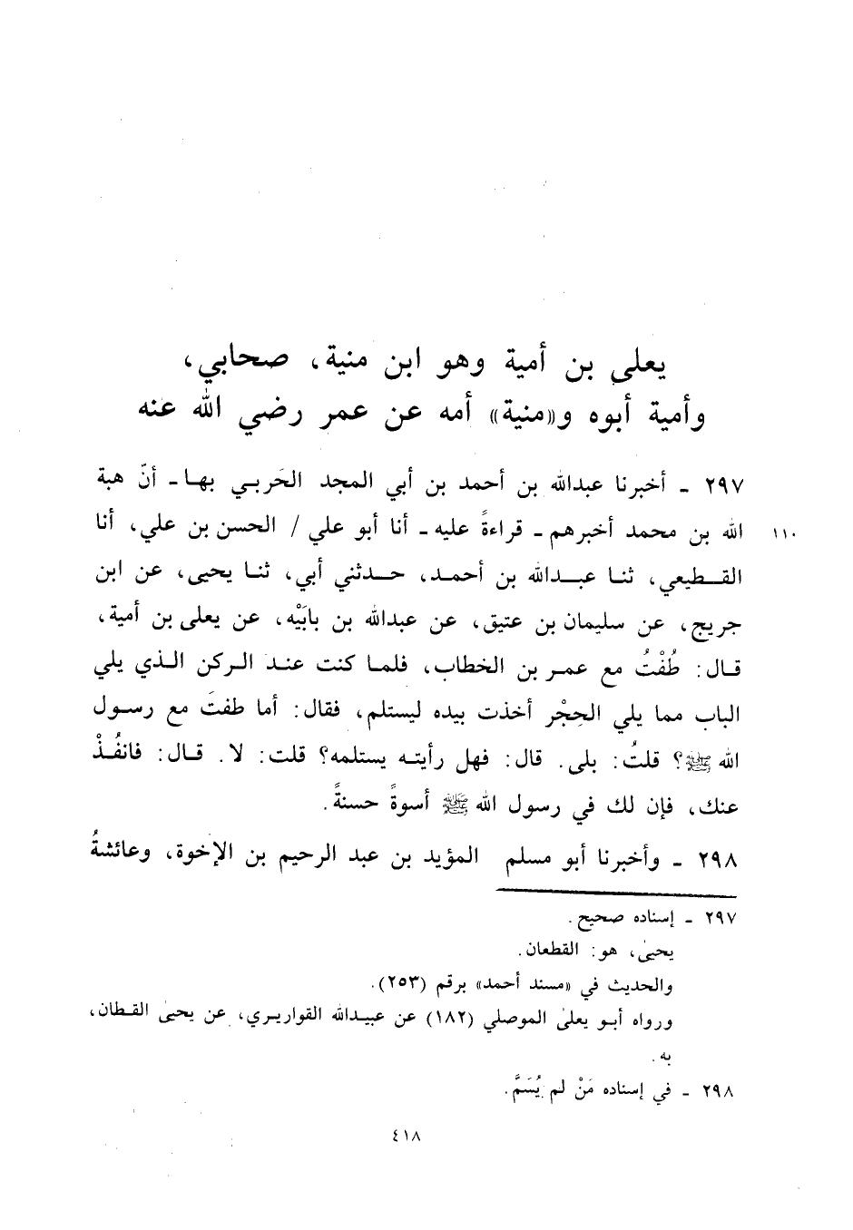 297 - أَخْبَرَنَا عبد الله بْنُ أَحْمَدَ بْنِ أَبِي الْمَجْدِ الْحَرْبِيُّ بِهَا أَنَّ هِبَةَ اللَّهِ بْنَ مُحَمَّدٍ أَخْبَرَهُمْ قِرَاءَةً عَلَيْهِ أَنا أَبُو عَلِيٍّ الْحَسَنُ بْنُ عَلِيٍّ أَنا الْقطيعِي ثَنَا عبد الله بْنُ أَحْمَدَ حَدَّثَنِي أَبِي ثَنَا يَحْيَى عَنِ ابْنِ جُرَيْجٍ عَنْ سُلَيْمَانَ بْنِ عَتِيقٍ عَنْ عبد الله بْنِ بَابَيْهِ عَنْ يَعْلَى بْنِ أُمَيَّةَ قَالَ طُفْتُ مَعَ عُمَرَ بْنِ الْخَطَّابِ فَلَمَّا كُنْتُ عِنْدَ الرُّكْنِ الَّذِي يَلِي الْبَابَ مِمَّا يَلِي الْحَجَرَ أَخَذْتُ بِيَدِهِ لِيَسْتَلِمَ فَقَالَ أَمَا طُفْتَ مَعَ رَسُولِ اللَّهِ صَلَّى اللَّهُ عَلَيْهِ وَسَلَّمَ قُلْتُ بَلَى قَالَ فَهَلْ رَأَيْتَهُ يَسْتَلِمُهُ قُلْتُ لَا قَالَ فَانْفُذْ عَنْكَ فَإِنَّ لَكَ فِي رَسُولِ اللَّهِ صَلَّى اللَّهُ عَلَيْهِ وَسَلَّمَ أُسْوَةٌ حَسَنَة (إِسْنَاده صَحِيح)