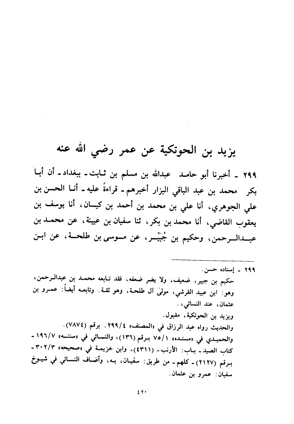 299 - أخبرنَا أَبُو حَامِد عبد الله بْنُ مُسْلِمِ بْنِ ثَابِتٍ بِبَغْدَادَ أَنَّ أَبَا بكر مُحَمَّد بن عبد الْبَاقِي الْبَزَّارَ أَخْبَرَهُمْ قِرَاءَةً عَلَيْهِ أَنا الْحَسَنُ بْنُ عَلِيٍّ الْجَوْهَرِيُّ أَنا عَلِيُّ بْنُ مُحَمَّدِ بْنِ أَحْمَدَ بْنِ كَيْسَانَ أَنا يُوسُفُ بْنُ يَعْقُوبَ الْقَاضِي أَنا مُحَمَّدُ بْنُ بَكْرٍ ثَنَا سُفْيَانُ بن عُيَيْنَة عَن مُحَمَّد بن عبد الرَّحْمَن وَحَكِيمِ بْنِ جُبَيْرٍ عَنْ مُوسَى بْنِ طَلْحَةَ عَن ابْن
