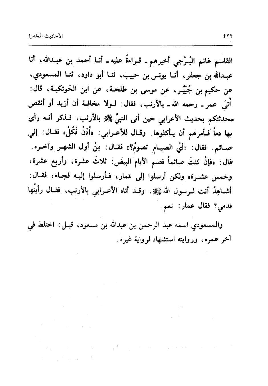 الْقَاسِم غَانِم الْبُرْجِيَّ أَخْبَرَهُمْ قِرَاءَةً عَلَيْهِ أَنا أَحْمَدُ بْنُ عبد الله أَنا عبد الله بْنُ جَعْفَرٍ أَنا يُونُسُ بْنُ حَبِيبٍ ثَنَا أَبُو دَاوُدَ ثَنَا الْمَسْعُودِيُّ عَنْ حَكِيمِ بْنِ جُبَيْرٍ عَنْ مُوسَى بْنِ طَلْحَةَ عَنِ ابْنِ الْحَوْتَكِيَّةِ قَالَ أُتِيَ عُمَرُ رَحِمَهُ اللَّهُ بِالأَرْنَبِ فَقَالَ لَوْلا مَخَافَةَ أَنْ أَزِيدَ أَوْ أُنْقِصَ حَدَّثْتُكُمْ بِحَدِيثِ الأَعْرَابِيِّ حِينَ أَتَى النَّبِيَّ صَلَّى اللَّهُ عَلَيْهِ وَسَلَّمَ بِالأَرْنَبِ فَذَكَرَ أَنَّهُ رَأَى بِهَا دَمًا فَأَمَرَهُمْ أَنْ يَأْكُلُوهَا وَقَالَ لِلأَعْرَابِيِّ ادْنُ فَكُلْ فَقَالَ إِنِّي صَائِمٌ فَقَالَ أَيُّ الصِّيَامِ تَصُومُ فَقَالَ مِنْ أَوَّلِ الشَّهْرِ وَآخِرِهِ قَالَ فَإِنْ كُنْتَ صَائِمًا فَصُمِ الأَيَّامَ الْبِيضَ ثَلاثَ عَشْرَةَ وَأَرْبَعَ عَشْرَةَ وَخَمْسَ عَشْرَةَ وَلَكِنْ أَرْسِلُوا إِلَى عَمَّارٍ فَأَرْسَلُوا إِلَيْهِ فَجَاءَ فَقَالَ أَشَاهِدٌ أَنْتَ لِرَسُولِ اللَّهِ صَلَّى اللَّهُ عَلَيْهِ وَسَلَّمَ وَقَدْ أَتَاهُ الأَعْرَابِيُّ بِالأَرْنَبِ فَقَالَ رَأَيْتَهَا تدمي فَقَالَ عمار نعم