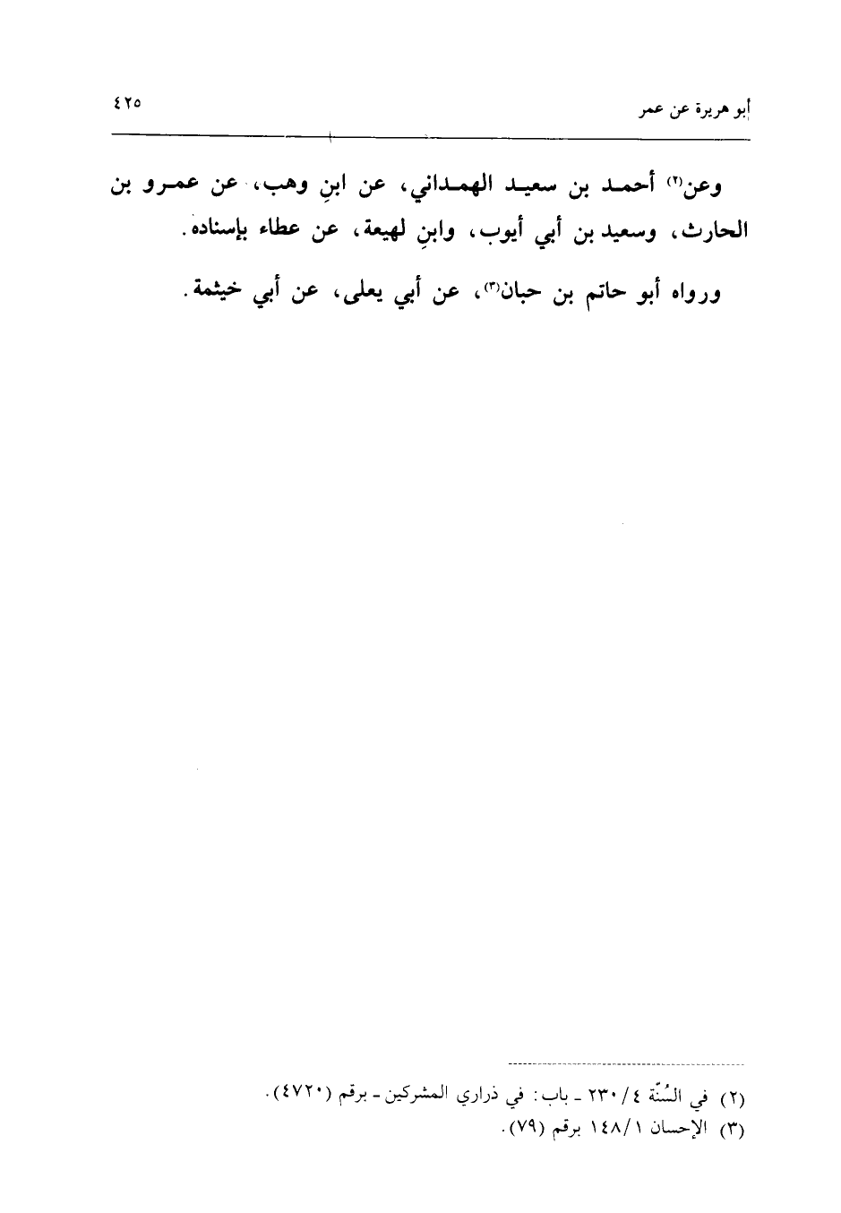وَعَنْ أَحْمَدَ بْنِ سَعِيدٍ الْهَمْدَانِيِّ عَنِ ابْنِ وَهْبٍ عَنْ عَمْرِو بْنِ الْحَارِثِ وَسَعِيدِ بْنِ أَبِي أَيُّوبَ وَابْنِ لَهِيعَةَ عَنْ عَطَاءٍ بِإِسْنَادِهِ وَرَوَاهُ أَبُو حَاتِمِ بْنُ حِبَّانَ عَنْ أَبِي يعلى عَن أبي خَيْثَمَة (إِسْنَاده ضَعِيف)