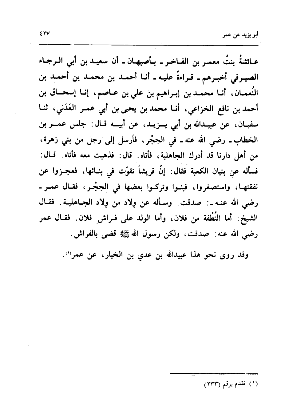 عَائِشَةُ بِنْتُ مَعْمَرِ بْنِ الْفَاخِرِ بِأَصْبَهَانَ أَنَّ سَعِيدَ بْنَ أَبِي الرَّجَاءِ الصَّيْرَفِيَّ أَخْبَرَهُمْ قِرَاءَةً عَلَيْهِ أَنَا أَحْمَدُ بْنُ مُحَمَّدِ بْنِ أَحْمَدَ بْنِ النُّعْمَانِ أَنَا مُحَمَّدُ بْنُ إِبْرَاهِيمَ بْنِ عَلِيِّ بْنِ عَاصِمٍ أَنا إِسْحَاقُ بْنُ أَحْمَدَ بْنِ نَافِعٍ الْخُزَاعِيُّ أَنا مُحَمَّدُ بْنُ يَحْيَى بْنِ أَبِي عُمَرَ الْعَدَنِيُّ ثَنَا سُفْيَانُ عَنْ عُبَيْدِ اللَّهِ بْنِ أَبِي يَزِيدَ عَنْ أَبِيهِ قَالَ جَلَسَ عُمَرُ بْنُ الْخَطَّابِ رَضِيَ اللَّهُ عَنْهُ فِي الْحِجْرِ فَأَرْسَلَ إِلَى رَجُلٍ مِنْ بَنِي زُهْرَةَ مِنْ أَهْلِ دَارِنَا قَدْ أَدْرَكَ الْجَاهِلِيَّةِ فَأَتَاهُ قَالَ فَذَهَبْتُ مَعَهُ فَأَتَاهُ قَالَ فَسَأَلَهُ عَنْ بُنْيَانِ الْكَعْبَةِ فَقَالَ إِنَّ قُرَيْشًا تَقَوَّتْ فِي بِنَائِهَا فَعَجِزُوا عَنْ نَفَقَتِهَا وَاسْتَصْغَرُوا فَبَنَوْا وَتَرَكُوا بَعْضَهَا فِي الْحِجْرِ فَقَالَ عُمَرُ رَضِيَ اللَّهُ عَنْهُ صَدَقْتَ وَسَأَلَهُ عَنْ وِلادٍ مِنْ وِلادِ الْجَاهِلِيَّةِ فَقَالَ الشَّيْخُ أَمَّا النُّطْفَةُ مِنْ فُلانٍ وَأَمَّا الْوَلَدُ عَلَى فِرَاشِ فُلانٍ فَقَالَ عُمَرُ رَضِيَ اللَّهُ عَنْهُ صَدَقْتَ وَلَكِنَّ رَسُولَ اللَّهِ صَلَّى اللَّهُ عَلَيْهِ وَسَلَّمَ قَضَى بِالْفِرَاشِ