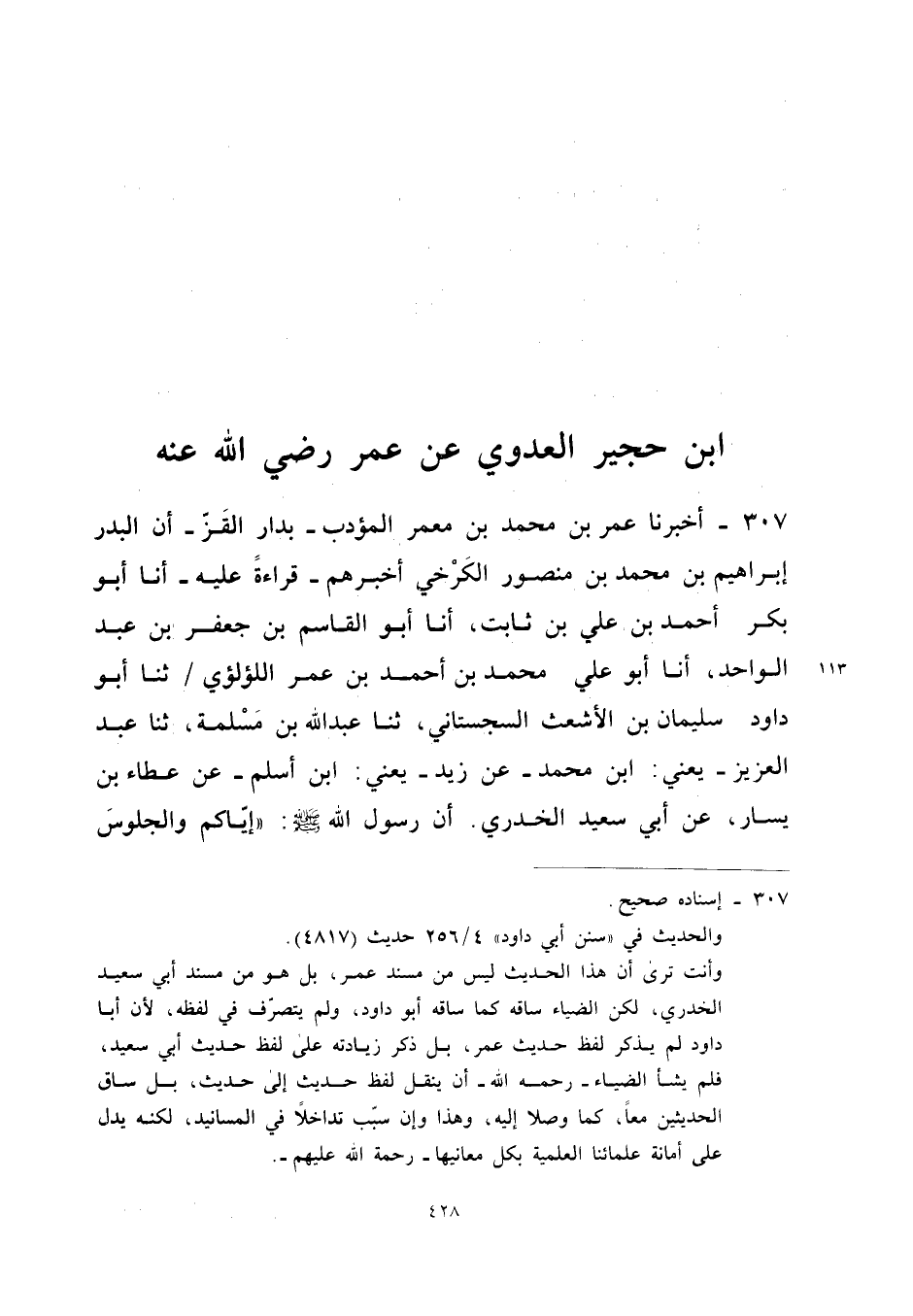 307 - أَخْبَرَنَا عُمَرُ بْنُ مُحَمَّدِ بْنِ مَعْمَرٍ الْمُؤَدِّبُ بِدَارِ الْقَزِّ أَنَّ الْبَدْرَ إِبْرَاهِيمَ بْنَ مُحَمَّدِ بْنِ مَنْصُورٍ الْكَرْخِيَّ أَخْبَرَهُمْ قِرَاءَةً عَلَيْهِ أَنا أَبُو بَكْرٍ أَحْمَدُ بْنُ عَلِيِّ بْنِ ثَابِتٍ أَنا أَبُو الْقَاسِمِ بْنُ جَعْفَرِ بْنِ عبد الْوَاحِد أَنا أَبُو عَلِيٍّ مُحَمَّدُ بْنُ أَحْمَدَ بْنِ عمر اللؤْلُؤِي ثَنَا أَبُو دَاوُدَ سُلَيْمَانُ بْنُ الأَشْعَثِ السِّجِسْتَانِيُّ ثَنَا عبد الله بن مسلمة ثَنَا عبد الْعَزِيز يَعْنِي ابْنَ مُحَمَّدٍ عَنْ زَيْدٍ يَعْنِي ابْنَ أَسْلَمَ عَنْ عَطَاءِ بْنِ يَسَارٍ عَنْ أَبِي سَعِيدٍ الْخُدْرِيِّ أَنَّ رَسُولَ اللَّهِ صَلَّى اللَّهُ عَلَيْهِ وَسَلَّمَ قَالَ إِيَّاكُمْ وَالْجُلُوسَ