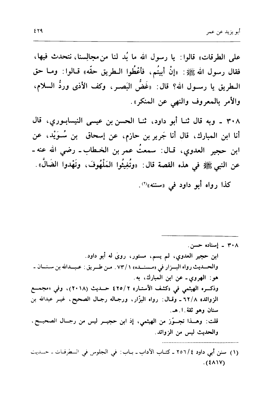 عَلَى الطُّرُقَاتِ قَالُوا يَا رَسُولَ اللَّهِ مَا بُدٌّ لَنَا مِنْ مَجَالِسِنَا نَتَحَدَّثُ فِيهَا فَقَالَ رَسُولُ اللَّهِ صَلَّى اللَّهُ عَلَيْهِ وَسَلَّمَ أَنَّ أَبَيْتُمْ فَأَعْطُوا الطَّرِيقَ حَقَّهُ قَالُوا وَمَا حَقُّ الطَّرِيقِ يَا رَسُولَ اللَّهِ قَالَ غَضُّ الْبَصَرِ وَكَفُّ الأَذَى وَرَدُّ السَّلامِ وَالأَمْرُ بِالْمَعْرُوفِ وَالنَّهْيُ عَن الْمُنكر (إِسْنَاده صَحِيح)