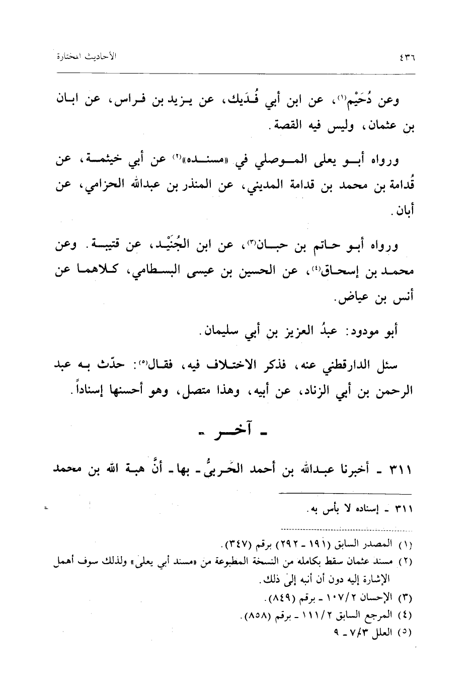 وَعَنْ دُحَيْمٍ عَنِ ابْنِ أَبِي فُدَيْكٍ عَنْ يَزِيدَ بْنِ فِرَاسٍ عَنْ أَبَانِ بْنِ عُثْمَانَ وَلَيْسَ فِيهِ الْقِصَّةُ وَرَوَاهُ أَبُو يَعْلَى الْمَوْصِلِيُّ فِي مُسْنَدِهِ عَنْ أَبِي خَيْثَمَةَ عَنْ قُدَامَةَ بْنِ مُحَمَّدِ بْنِ قُدَامَةَ الْمَدِينِيِّ عَنِ الْمُنْذِرِ بن عبد الله الْحِزَامِيِّ عَنْ أَبَانٍ وَرَوَاهُ أَبُو حَاتِمِ بْنُ حِبَّانَ عَنِ ابْنِ الْجُنَيْدِ عَنْ قُتَيْبَةَ وَعَنْ مُحَمَّدِ بْنِ إِسْحَاقَ عَنِ الْحُسَيْنِ بْنِ عِيسَى الْبَسْطَامِيِّ كِلاهُمَا عَنْ أَنَسِ بْنِ عِيَاضٍ أَبُو مودود عبد الْعَزِيز بْنُ أَبِي سُلَيْمَانَ سُئِلَ الدَّارَقُطْنِيُّ عَنْهُ فَذَكَرَ الِاخْتِلَاف فِيهِ فَقَالَ حدث بِهِ عبد الرَّحْمَن بْنُ أَبِي الزِّنَادِ عَنْ أَبِيهِ وَهَذَا مُتَّصِلٌ وَهُوَ أحْسنهَا إِسْنَادًا (إِسْنَاده حسن)