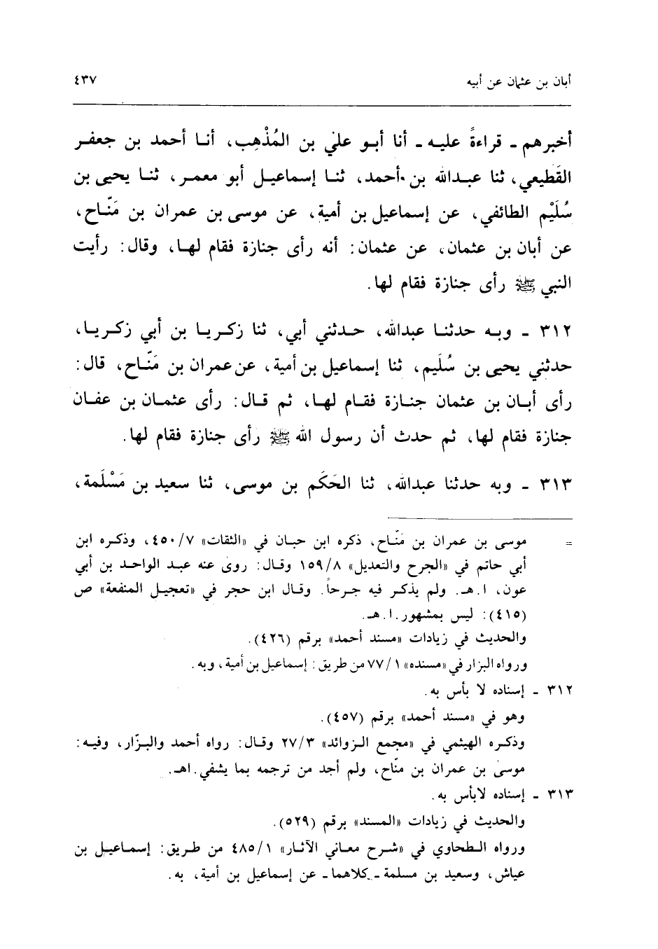313 - وَبِه حَدثنَا عبد الله ثَنا الْحَكَمُ بْنُ مُوسَى ثَنَا سَعِيدُ بْنُ مَسْلَمَةَ عَنْ إِسْمَاعِيلَ بْنِ أُمَيَّةَ عَنْ مُوسَى بْنِ عِمْرَانَ بْنِ مَنَّاحٍ عَنْ أَبَانِ بْنِ عُثْمَانَ أَنَّهُ رَأَى جَنَازَةً مُقْبِلَةً فَلَمَّا رَآهَا قَامَ فَقَالَ رَأَيْتُ عُثْمَانَ يَفْعَلُ ذَلِكَ وَخَبَّرَنِي أَنَّهُ رَأَى النَّبِيَّ صَلَّى اللَّهُ عَلَيْهِ وَسَلَّمَ يَفْعَله