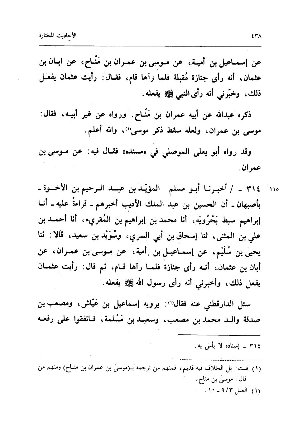 314 - أخبرنَا أَبُو مُسلم الْمُؤَيد بن عبد الرَّحِيم بن الْأُخوة بأصبهان أَن الْحُسَيْن بن عبد الْملك الأَدِيبَ أَخْبَرَهُمْ قِرَاءَةً عَلَيْهِ أَنا إِبْرَاهِيمُ سِبْطُ بحرويه أَنا مُحَمَّد بن إِبْرَاهِيم بن المقرىء أَنا أَحْمَدُ بْنُ عَلِيِّ بْنِ الْمُثَنَّى ثَنَا إِسْحَاقُ بْنُ أَبِي السَّرِيِّ وَسُوَيْدُ بْنُ سَعِيدٍ قَالا ثَنَا يَحْيَى بْنُ سُلَيْمٍ عَنْ إِسْمَاعِيلَ بْنِ أُمَيَّةَ عَنْ مُوسَى بْنِ عِمْرَانَ عَنْ أَبَانِ بْنِ عُثْمَانَ أَنَّهُ رَأَى جَنَازَةً فَلَمَّا رَآهَا قَامَ ثُمَّ قَالَ رَأَيْتُ عُثْمَانَ يَفْعَلُ ذَلِكَ وَأَخْبَرَنِي أَنَّهُ رَأَى رَسُولَ اللَّهِ صَلَّى اللَّهُ عَلَيْهِ وَسَلَّمَ يَفْعَلُهُ