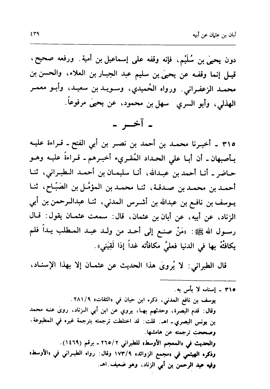 315 - أَخْبَرَنَا مُحَمَّدُ بْنُ أَحْمَدَ بْنِ نَصْرٍ بْنِ أَبِي الْفَتْحِ قِرَاءَةً عَلَيْهِ بِأَصْبَهَانَ أَنَّ أَبَا عَليّ الْحداد المقرىء أَخْبَرَهُمْ قِرَاءَةً عَلَيْهِ وَهُوَ حَاضِرٌ أَنا أَحْمَدُ بن عبد الله أَنا سُلَيْمَانُ بْنُ أَحْمَدَ الطَّبَرَانِيُّ ثَنَا أَحْمَدُ بْنُ مُحَمَّدِ بْنِ صَدَقَةَ ثَنا مُحَمَّدُ بْنُ الْمُؤَمَّلِ بْنِ الصَّبَّاحِ ثَنَا يُوسُفُ بْنُ نَافِعِ بن عبد الله بن أَشْرَس الْمدنِي ثَنَا عبد الرَّحْمَن بْنُ أَبِي الزِّنَادِ عَنْ أَبِيهِ عَنْ أَبَانِ بْنِ عُثْمَانَ قَالَ سَمِعْتُ عُثْمَانَ يَقُولُ قَالَ رَسُولُ اللَّهِ صَلَّى اللَّهُ عَلَيْهِ وَسَلَّمَ مَنْ صنع الى أحد من ولد عبد الْمطلب يدا فَلم يُكَافِئهُ بهَا فِي الدُّنْيَا عَليّ مُكَافَأَتُهُ غَدًا إِذَا لَقِيَنِي