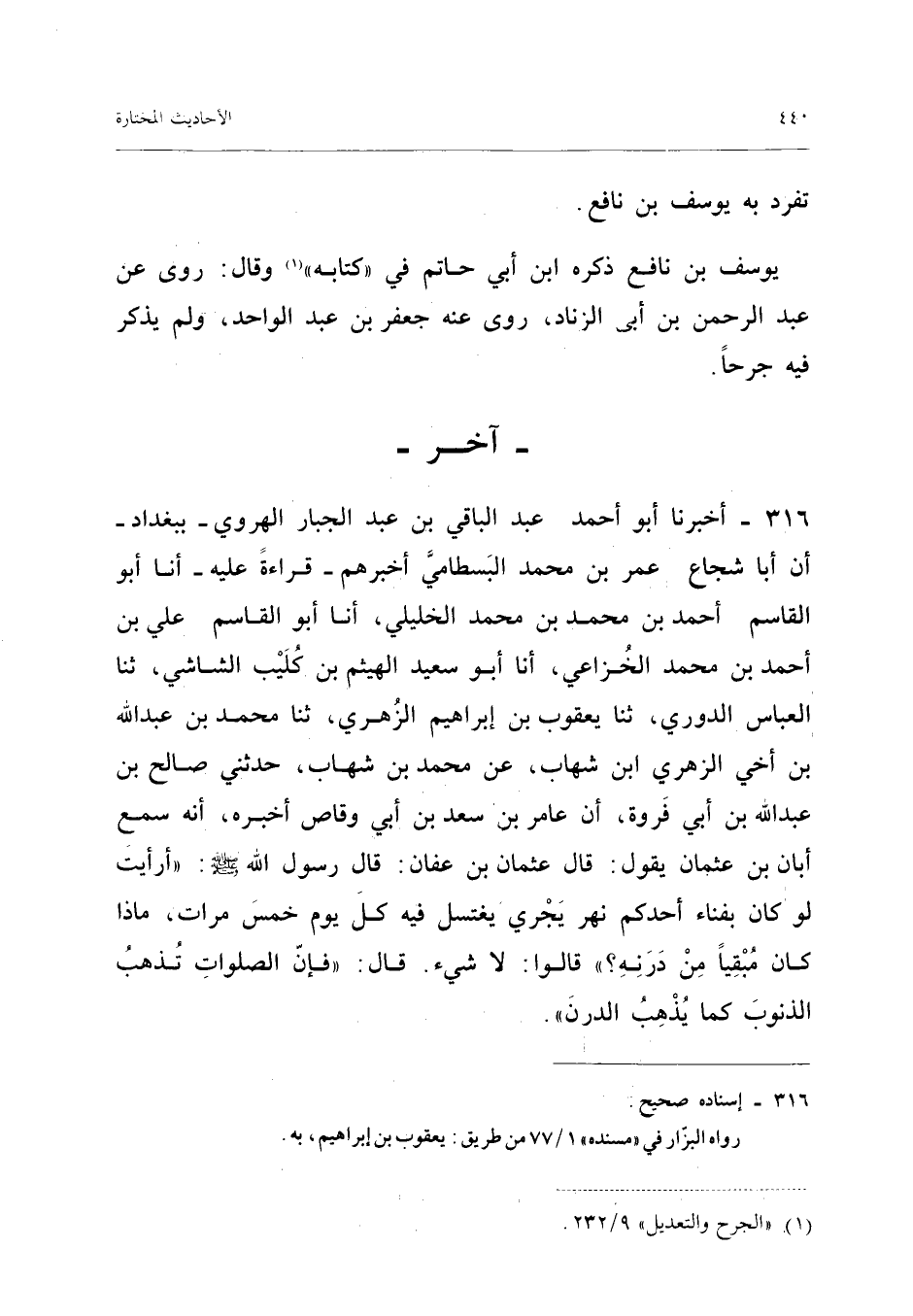 316 - أخبرنَا أَبُو أَحْمد عبد الْبَاقِي بن عبد الْجَبَّار الْهَرَوِيُّ بِبَغْدَادَ أَنَّ أَبَا شُجَاعٍ عُمَرَ بْنَ مُحَمَّدٍ الْبَسْطَامِيَّ أَخْبَرَهُمْ قِرَاءَةً عَلَيْهِ أَنا أَبُو الْقَاسِمِ أَحْمَدُ بْنُ مُحَمَّدِ بْنِ مُحَمَّدٍ الْخَلِيلِيُّ أَنا أَبُو الْقَاسِمِ عَلِيُّ بْنُ أَحْمَدَ بْنِ مُحَمَّدٍ الْخُزَاعِيُّ أَنا أَبُو سَعِيدٍ الْهَيْثَمُ بْنُ كُلَيْبٍ الشَّاشِيُّ ثَنَا الْعَبَّاسُ الدُّورِيُّ ثَنَا يَعْقُوبُ بن إِبْرَاهِيم الزُّهْرِيّ ثَنَا مُحَمَّد بن عبد الله ابْنُ أَخِي الزُّهْرِيِّ ابْنُ شِهَابٍ عَنْ مُحَمَّدِ بن شهَاب حَدثنِي صَالح بن عبد الله بْنِ أَبِي فَرْوَةَ أَنَّ عَامِرَ بْنَ سَعْدِ بْنِ أَبِي وَقَّاصٍ أَخْبَرَهُ أَنَّهُ سَمِعَ أَبَانَ بْنَ عُثْمَانَ يَقُولُ قَالَ عُثْمَانُ بْنُ عَفَّانَ قَالَ رَسُولُ اللَّهِ صَلَّى اللَّهُ عَلَيْهِ وَسَلَّمَ أَرَأَيْتَ لَوْ كَانَ بِفِنَاءِ أَحَدِكُمْ نَهْرٌ يَجْرِي يَغْتَسِلُ فِيهِ كُلَّ يَوْمٍ خَمْسَ مَرَّاتٍ مَاذَا كَانَ مُبْقِيًا مِنْ دَرَنِهِ قَالُوا لَا شَيْءَ قَالَ فَإِنَّ الصَّلَوَاتِ تُذْهِبُ الذُّنُوبَ كَمَا يَذْهَبُ الدَّرن (إِسْنَاده صَحِيح)