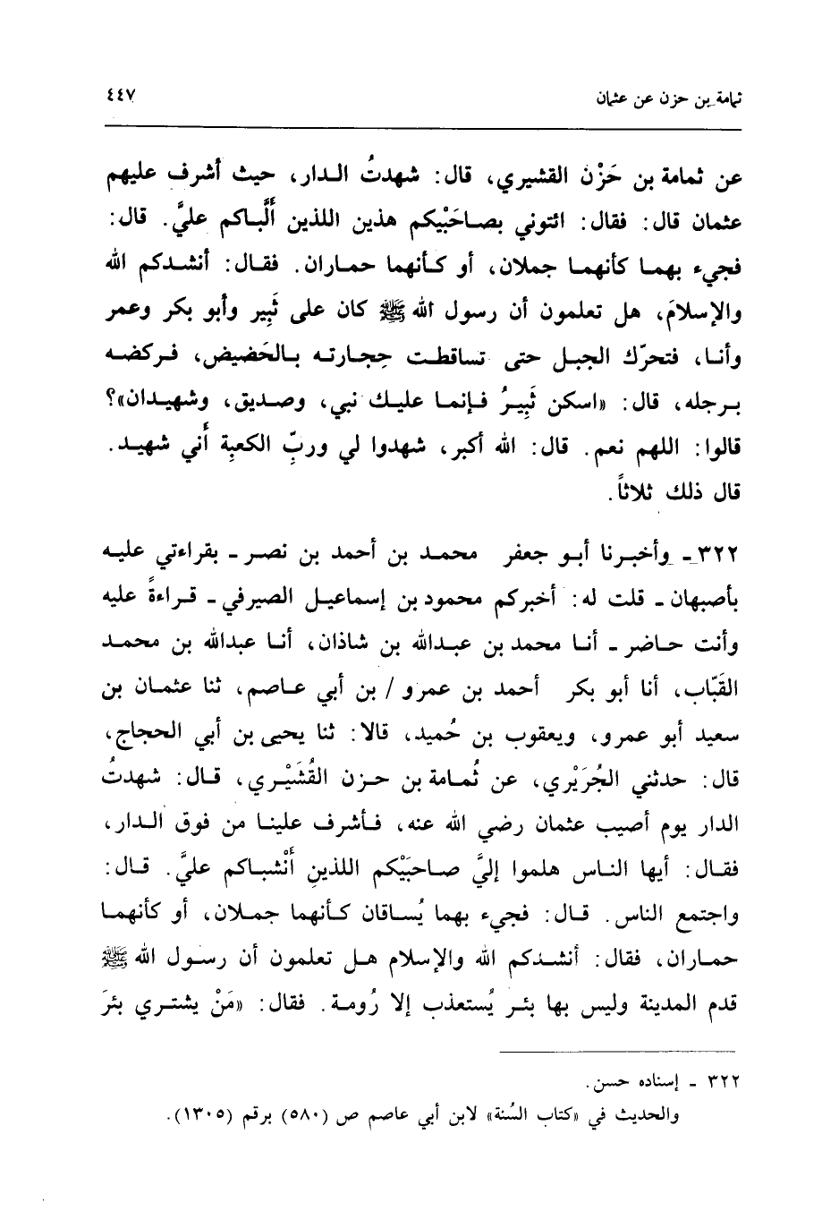 322 - وَأَخْبَرَنَا أَبُو جَعْفَرٍ مُحَمَّدُ بْنُ أَحْمَدَ بْنِ نَصْرٍ بِقِرَاءَتِي عَلَيْهِ بِأَصْبَهَانَ قُلْتُ لَهُ أَخْبَرَكُمْ مَحْمُودُ بْنُ إِسْمَاعِيلَ الصَّيْرَفِيُّ قِرَاءَةً عَلَيْهِ وَأَنْتَ حَاضر أَنا مُحَمَّد بن عبد الله بن شَاذان أَنا عبد الله بْنُ مُحَمَّدٍ الْقَبَّابُ أَنا أَبُو بَكْرٍ أَحْمَدُ بْنُ عَمْرِو بْنِ أِبي عَاصِمٍ ثَنَا عُثْمَانُ بْنُ سَعِيدٍ أَبُو عَمْرٍو وَيَعْقُوبُ بْنُ حُمَيْدٍ قَالا ثَنَا يَحْيَى بْنُ أَبِي الْحَجَّاجِ قَالَ حَدَّثَنِي الْجُرَيْرِيُّ عَنْ ثُمَامَةَ بْنِ حَزَنٍ الْقُشَيْرِيِّ قَالَ شَهِدْتُ الدَّارَ يَوْمَ أُصِيبَ عُثْمَانُ رَضِيَ اللَّهُ عَنْهُ فَأَشْرَفَ عَلَيْنَا مِنْ فَوْقِ الدَّارِ فَقَالَ أَيُّهَا النَّاسُ هَلُمُّوا إِلَيَّ صَاحِبَيْكُمُ اللَّذَيْنِ أَنْشَبَاكُمْ عَلَيَّ قَالَ وَاجْتَمَعَ النَّاسُ قَالَ فَجِيءَ بِهِمَا يُسَاقَانِ كَأَنَّهُمَا جَمَلانِ أَوْ كَأَنَّهُمَا حِمَارَانِ فَقَالَ أنُشْدِكُمُ اللَّهَ وَالإِسْلامَ هَلْ تَعْلَمُونَ أَنَّ رَسُولَ اللَّهِ صَلَّى اللَّهُ عَلَيْهِ وَسَلَّمَ قَدِمَ الْمَدِينَةَ وَلَيْسَ بِهَا بِئْرٌ يُسْتَعْذَبُ إِلا رُومَةَ فَقَالَ مَنْ يَشْتَرِي بِئْرَ