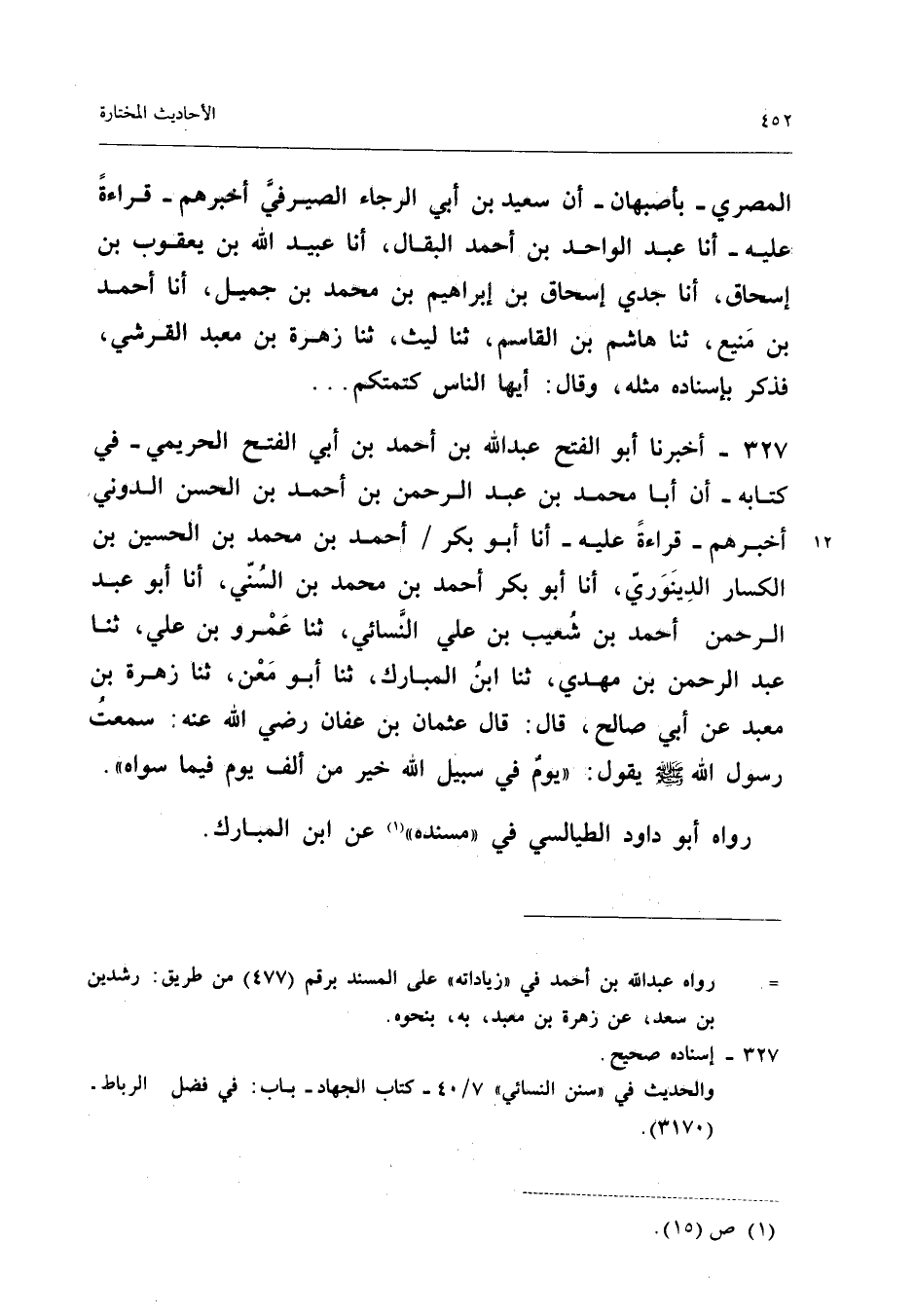 327 - أخبرنَا أَبُو الْفَتْح عبد الله بْنُ أَحْمَدَ بْنِ أَبِي الْفَتْحِ الْحَرِيمِيُّ فِي كِتَابه أَن أَبَا مُحَمَّد بن عبد الرَّحْمَن بْنَ أَحْمَدَ بْنِ الْحَسَنِ الدُّونِيَّ أَخْبَرَهُمْ قِرَاءَةً عَلَيْهِ أَنا أَبُو بَكْرٍ أَحْمَدُ بْنُ مُحَمَّدِ بْنُ الْحُسَيْنِ بْنِ الْكَسَّارِ الدِّينَوَرِيُّ أَنا أَبُو بَكْرٍ أَحْمَدُ بْنُ مُحَمَّدِ بْنِ السُّنِّيِّ أَنا أَبُو عبد الرَّحْمَن أَحْمَدُ بْنُ شُعَيْبِ بْنِ عَلِيٍّ النَّسَائِيُّ ثَنَا عَمْرو بن عَليّ ثَنَا عبد الرَّحْمَن بْنُ مَهْدِيٍّ ثَنَا ابْنُ الْمُبَارَكِ ثَنَا أَبُو مَعْنٍ ثَنَا زُهْرَةُ بْنُ مَعْبَدٍ عَنْ أَبِي صَالِحٍ قَالَ قَالَ عُثْمَانُ بْنُ عَفَّانَ رَضِيَ اللَّهُ عَنْهُ سَمِعْتُ رَسُولَ اللَّهِ صَلَّى اللَّهُ عَلَيْهِ وَسَلَّمَ يَقُولُ يَوْمٌ فِي سَبِيلِ اللَّهِ خَيْرٌ مِنْ أَلْفِ يَوْمٍ فِيمَا سِوَاهُ