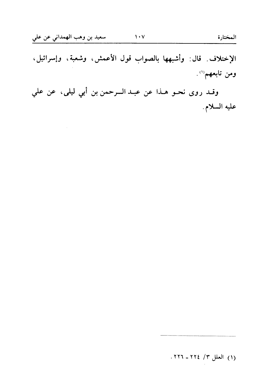 الاخْتِلافِ قَالَ وَأَشْبَهُهَا بِالصَّوَابِ قَوْلُ الأَعْمَشِ وَشُعْبَةَ وَإِسْرَائِيلَ وَمَنْ تَابَعَهُمْ وَقَدْ رُوِيَ نَحْوُ هَذَا عَن عبد الرَّحْمَن بْنِ أَبِي لَيْلَى عَنْ عَلِيٍّ عَلَيْهِ السَّلامُ (إِسْنَاده صَحِيح)