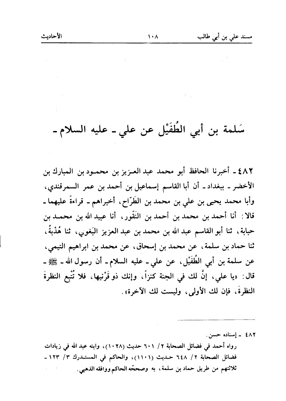 482 - أخبرنَا الْحَافِظ أَبُو مُحَمَّد عبد الْعَزِيز بْنُ مَحْمُودِ بْنِ الْمُبَارَكِ بْنِ الأَخْضَرِ بِبَغْدَادَ أَنَّ أَبَا الْقَاسِمِ إِسْمَاعِيلَ بْنَ أَحْمَدَ بْنِ عُمَرَ السَّمَرْقَنْدِيَّ وَأَبَا مُحَمَّدٍ يَحْيَى بْنَ عَلِيِّ بْنِ مُحَمَّدِ بْنِ الطَّرَّاحِ أَخْبَرَاهُمْ قِرَاءَةً عَلَيْهِمَا قَالا أَنَا أَحْمَدُ بْنُ مُحَمَّدِ بْنِ أَحْمَدَ بن النقور أَنا عبيد الله بْنُ مُحَمَّدِ بْنِ حُبَابَةَ ثَنَا أَبُو الْقَاسِمِ عبد الله بن مُحَمَّد بن عبد الْعَزِيز الْبَغَوِيُّ ثَنَا هُدْبَةُ ثَنَا حَمَّادُ بْنُ سَلَمَةَ عَنْ مُحَمَّدِ بْنِ إِسْحَاقَ عَنْ مُحَمَّدِ بْنِ إِبْرَاهِيمَ التَّيْمِيِّ عَنْ سَلَمَةَ بْنِ أَبِي الطُّفَيْلِ عَنْ عَلِيٍّ عَلَيْهِ السَّلامُ أَنَّ رَسُولَ اللَّهِ صَلَّى اللَّه عَلَيْهِ وَسَلَّمَ قَالَ يَا عَلِيُّ إِنَّ لَكَ فِي الْجَنَّةِ كَنْزًا وَإِنَّكَ ذُوَ قَرْنَيْهَا فَلا تُتْبِعِ النَّظْرَةَ النَّظْرَةَ فَإِنَّ لَكَ الأولى وَلَيْسَت لَك الْآخِرَة (إِسْنَاده حسن)