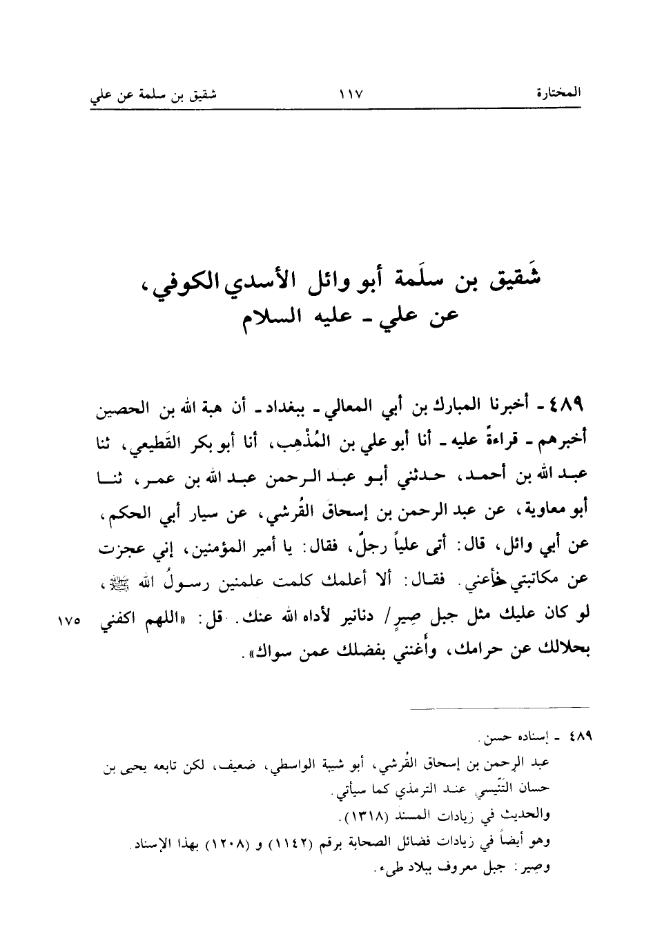489 - أَخْبَرَنَا الْمُبَارَكُ بْنُ أَبِي الْمَعَالِي بِبَغْدَادَ أَنَّ هِبَةَ اللَّهِ بْنَ الْحُصَيْنِ أَخْبَرَهُمْ قِرَاءَةً عَلَيْهِ أَنا أَبُو عَلِيِّ بْنُ الْمُذْهِبِ أَنا أَبُو بَكْرٍ الْقَطِيعِيُّ ثَنَا عبد الله بن أَحْمد حَدثنِي أَبُو عبد الرَّحْمَن عبد الله بن عمر ثَنَا أَبُو مُعَاوِيَة عَن عبد الرَّحْمَن بْنِ إِسْحَاقَ الْقُرَشِيِّ عَنْ سَيَّارٍ أَبِي الْحَكَمِ عَنْ أَبِي وَائِلٍ قَالَ أَتَى عَلِيًّا رَجُلٌ فَقَالَ يَا أَمِيرَ الْمُؤْمِنِينَ إِنِّي عَجِزْتُ عَنْ مكاتبتي فأعني فَقَالَ أَلا أعلمك كلمت علمنين رَسُولُ اللَّهِ صَلَّى اللَّه عَلَيْهِ وَسَلَّمَ لَوْ كَانَ عَلَيْكَ مِثْلُ جَبَلِ صِيرٍ دَنَانِيرَ لأَدَّاهُ اللَّهُ عَنْكَ قُلِ اللَّهُمَّ اكْفِنِي بِحَلالِكَ عَنْ حرامك وأغنني بِفَضْلِك عَمَّن سواك (إِسْنَاده حسن)